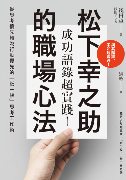 內容簡介 " 現代社會需要的不是「超譯」,而是真正派得上用場的「超實踐」書籍! 絕無僅有,具體實踐偉人名言的「紙一張」商業技巧! 只要用「紙一張」統整你的想法和心得, 抱持行動優先的心態, 將「經營之神」松下幸之助的經營理念與工作觀 轉化成自己的生活態度與工作方式 真正實踐成功的職場與人生! ・市面上的商管書多半訴求「簡單易懂」,其實妨礙了讀者的學習! ・所謂的「超譯」,通常讀了找不到重點,也看不到具體行動方針! ・用「紙一張」有效整理重點、拿回思考主導權,自省思考+行動實踐經營之神的名言! 松下幸之助——大名鼎鼎的日本傳奇經營之神,他的成功之道與人生智慧,是眾多企業領導者效法學習的典範;他說過的金玉良言與成功語錄句句發人深省,是想要提升自我的讀者不會錯過的學習對象。但是,奇蹟不是天上掉下來的!光是熟讀松下幸之助的名言金句,就算知道得再多,沒有積極的實踐心態與方法,很容易流於知易行難、不上不下的尷尬處境。 本書作者淺田卓從20歲開始每年至少閱讀100本商管書,有感於市面上的商管書無法有效引導讀者付諸行動,就算讀了也無法在職場活用,甚至阻礙讀者進步,於是提出「紙一張」商業技巧,將松下幸之助的名言化為實際行動,幫助讀者打破現狀! ★為什麼是「紙一張」? ・只花3分鐘填滿一張紙,就能將被大量資訊搞得焦頭爛額的腦袋整理好。 ・用一張紙整理好的內容特別一目瞭然,對方容易理解。 ・紙一張思考術能夠應用在時間管理、行動實踐、習慣培養等,具體提升行動力! ★為什麼是松下幸之助? ・松下幸之助是「先做看看再說」的最佳典範:學以致用,行動優先! ・松下幸之助證明「超實踐」比「超譯」重要:松下的言語平易近人,讀者容易融會貫通,他的觀點也最符合本書的基調。 ・現代商業人士面臨的環境和挑戰比起從前更顯嚴峻,容易為精神與身體失衡所苦。因此,更需要閱讀正面積極的松下幸之助的著作,從他的言行之中獲得勇氣! ★獻給不管讀了多少商管書,都不曾有所改變的人 前所未有、打破現狀!超過30萬人學習的「紙一張」思考工作術+松下幸之助的名言實踐方式,幫助你減少加班、提升業績、提升管理能力,讓各式各樣的商業課題迎刃而解。本書特色 1.收錄松下幸之助最為人熟悉的名言佳句,結合「紙一張」思考技巧,從中過濾思緒,為職場挑戰與人生難題找出最佳解決方案。 2.作者點出現代人閱讀商業書籍的一個盲點:只知Input而忽略真正具有實質意義的Output。在組織、職位都被細分化的現代商業環境,廣泛地吸收新知、方法論已蔚為趨勢,然而對於每一個「個人」而言,將能力培養聚焦於其眼前課題才具有實質意義。 3.本書讓讀者認識到「資訊整理」的重要性。對有志於新興服務業(顧問、行銷、媒體、新創)發展的讀者而言,精準的溝通技巧無疑是所處行業的核心競爭力。讓傳達者以實作的方式體驗「客觀的資訊視覺化」,進而達到有效溝通的價值觀,是現代上班族不可或缺的重要技能。"