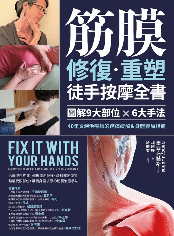 作者介紹 南西.約翰斯 理學碩士 (MS),職能治療師(OTR L) 擁有40年職業治療師經驗,曾在4個不同州擔任臨床與管理職務,持續努力使用雙手幫助患者。最早學習如何治療神經系統疾病患者,也曾為持續疼痛的患者進行激痛點按摩治療。後來接受筋膜鬆解術訓練,治療成果有了很大的進步。本書是回顧過去十幾年的治療經驗並對其反思,希望在退休後,這本書仍能為治療師及患者們帶來許多幫助與樂趣。聯絡資訊:www.FixitWithYourHands.com