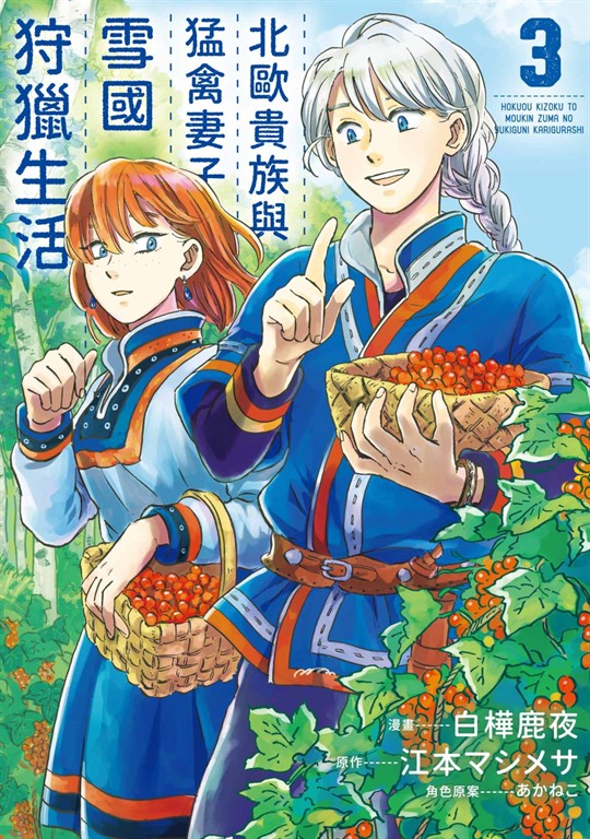 作者介紹 漫畫:白樺鹿夜日本漫畫家,擅長大自然、慢活以及美食的描繪。代表作品《北歐貴族與猛禽妻子的雪國狩獵生活》《メグさんのあぜ道ごはん》。原作:江本マシメサ 日本小說家,以本作《北歐貴族與猛禽妻子的雪國狩獵生活》拿下第三回網路小說大賞之金賞,活躍於「小説家になろう」網路小說平台上。代表作品《北歐貴族與猛禽妻子的雪國狩獵生活》最新連載中《隣国に輿入れした王女付きモフモフ侍女ですが、本当の王女は私なんです〜立場と声を奪われましたが、命の危機に晒されているので傍観します〜》