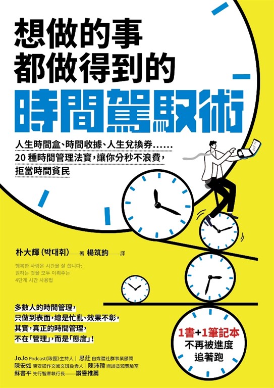內容簡介 多數人的時間管理,只做到表面,總是效果不彰、被進度追著跑,其實,真正的時間管理,不在「管理」,而是「態度」!★ 韓國超人氣時間管理專家,3週內成功幫一名國中生從第13名變成第1名★ 韓國網路書店Yes24時間管理類TOP100逾10週,讀者評分9.8超高評價★ 隨書附贈「駕馭時間筆記本」,收錄20種時間管理法寶◎ 時間管理,為什麼會越管越忙亂?時間的概念很模糊,看不見、摸不著,多數人只知道一天有24小時,時間無法倒回。其實,時間跟生命沒有兩樣,對每個人的價值也都不一樣,如果不懂得時間對你而言代表什麼,學再多管理時間的方法,也只會越管越忙亂。◎ 核心不在「管理」,而是「自我」與「態度」韓國超人氣演講家、時間管理專家朴大輝,輔導超過15,000名學員,3週內成功幫一名國中生從第13名變成第1名。他發現,「時間管理」之所以對多數人而言那麼困難,是因為大部分人都不知道,時間管理其實是種「自我管理」,如果不能養成珍惜時間的態度,即使再怎麼管理時間,還是只能原地踏步。◎運用4階段20種時間管理法寶,想做的事都做得到朴大輝主張,若想妥善運用時間,必須把焦點鎖定在自己身上,也就是先管理好自己,就能管理好時間,因此,他提出「4階段時間駕馭術」和20種時間管理法寶,每個階段都有不同的技巧與工具可以使用,幫你建立正確對待時間的態度,具體算出屬於你的時間價值──.描繪內心的「目標」:填寫「夢想熱氣球」、「人生兌換券」……釐清自己真正想做的事.制定有效的「計畫」:利用「習慣追蹤器」、「小步伐擊破」……擬出具體又有效的計畫.確實「執行」:善用「每日的16個時間箱」、「Say NO!流程圖」……不怕半途而廢.客觀「回饋」再出發:透過「每天5分鐘回饋」、「每日確認清單」……通往達標方向本書還有更多時間駕馭術的具體方法和步驟,幫你了解時間對你的價值,重新檢視自我對事情的輕重緩急,拒當時間貧民,任何想做的事都能做得到,讓成就充滿每一天,過上不後悔的人生!◆ 特別附贈:駕馭時間筆記本筆記本收錄20種時間管理法寶,包括:人生時間盒、時間收據、夢想熱氣球……供讀者寫下人生目標與製作時間管理計畫。你可以根據自己的情況和需求活用各種時間圖表,逐步熟練4階段時間駕馭術,改善時間管理能力,讓自己的進步足跡清晰可見!