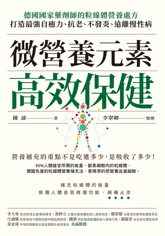 內容簡介 -德國國家藥劑師的粒線體營養處方,打造最強自癒力、抗老、不發炎、遠離慢性病-營養補充的重點不是吃進多少,是吸收了多少!90%人體器官所需的能量,都靠細胞內的粒線體,德國先進的粒線體營養補充法,更精準的把營養送進細胞,補充粒線體的能量,恢復人體自我修復功能,病痛止步營養補充品百百種,怎麼知道是不是有效?要補充營養,吃天然的食物應該比維他命更好吧?年過半百,再保健還來得及嗎?九成的疾病源自粒線體能量不足,長期補充微營養元素有效預防疾病。粒線體最重要的任務就是產生能量,維持各器官運作。一旦粒線體老化,器官會跟著老化,再加上壓力、缺乏睡眠等因素,粒線體加速損壞,身體各項功能就會失序而生病。只要強化粒線體,就能修復身體運作,透過微營養元素補給粒線體能量,從根本改善健康,從體內打造堅強防禦力。在德國慕尼黑聖安東尼藥局執業超過三十年的德國國家藥劑師陳諦,觀察到病人長期攝取藥物且逐漸加重,加上自身罹患心血管疾病,進而專研粒線體自然保健,以多年執業經歷結合德國領先的粒線體醫學研究,打造出能夠精準補充粒線體營養的微營養元素金字塔。在忙碌生活中,方便補充有效且正確的營養。粒線體是「人體發電廠」,平均每個細胞約有 1500 個粒線體粒線體供給身體所需能量,如果失去活力,就會損害健康現今農作物因化肥和農藥的使用,營養價值已不如從前現代人生活繁忙難以均衡飲食,從食物中攝取足夠的微營養從眾多保健食品中,精選出十大重要微營養元素透過補充微營養元素有效強化粒線體,維持身體能量續航力針對不同年齡和性別需求,量身打造微營養補充方案常見的疲勞或是慢性病如糖尿病,甚至是癌症、憂鬱症也可以靠加強粒線體營養改善「我希望能夠協助更多人,把疾病阻絕在發作之前。」每個人都可以從這本書找到讓自己更健康的途徑。微營養輔助方案可以實際落實於生活中,日日高效保健,遠離病痛。誠心推薦資深新聞主播 職場專家、國立教育廣播電台主持人、醒吾科技大學專任教授 李大華太瑿生醫集團創辦人兼總院長 黃仲立洛桑預防醫學集團教育長 鄭榮耀前萬事達卡國際組織中國區總經理、前永豐銀行總經理 江威娜網訊電通集團創辦人兼執行長、德益網(股)公司董事長 陳諧台北泰安醫院院長、台灣家庭醫學醫學會第8屆理事長、台灣社區醫學會理事長、萬芳醫院前副院長暨執行長、台北醫學大學家庭醫學創科主任、台心醫院執行董事暨院長 謝瀛華中華民國藥師公會全國聯合會理事長 黃金舜