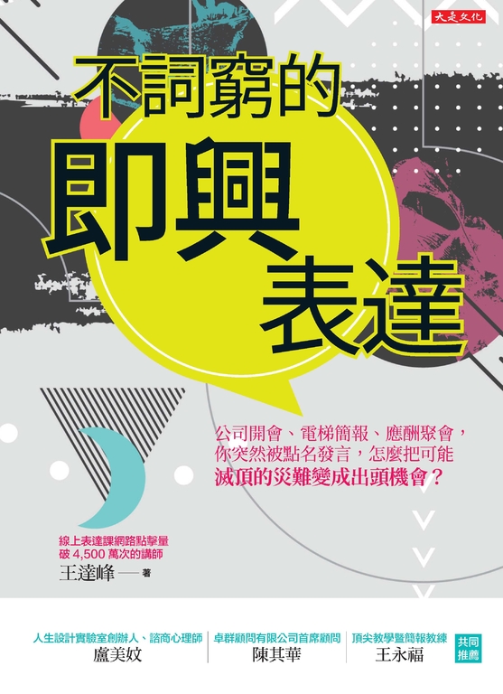 公司開會、電梯簡報、婚禮、喪禮、畢業典禮、同學會……所有你會遇到的即興表達,該怎麼說?書中有範例。讓你告別廢話、直達人心,還能讓人留下永誌不忘的印象。