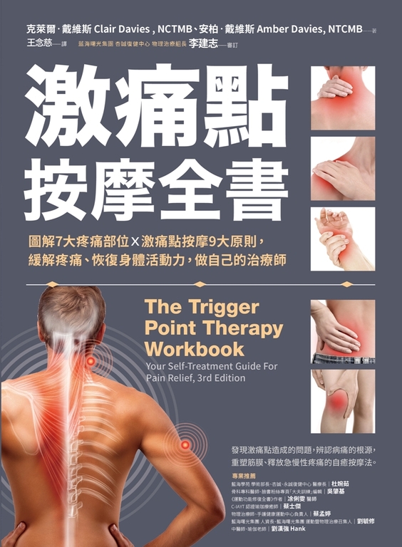 內容簡介 激痛點療法先驅,暢銷20年經典著作超過600張插圖,找出精確激痛點位置,用對手法按摩、消除痛症陳年頭痛、肩頸痠痛老是治不好?有可能是你搞錯位置、用錯方法!因為身體的疼痛是會連動的,有時候感到不舒服的位置,和真正有狀況的位置差了十萬八千里……「激痛點療法」可以針對疼痛的源頭,徹底終結痛症! 治療師嘗試用徒手按摩處理疼痛時,發現效果不如預期;健身教練試著用按摩工具幫助學員放鬆時,卻無法完全釋放……當我們試圖解決疼痛時,為什麼會遇到許多挑戰與瓶頸?本書將補足解痛時遇到的缺惑,完整收錄每個肌肉區塊的連動關係,任何人都可以照著圖示循線查閱。◎ 暢銷20年,最龐大且完整的「激痛點地圖」激痛點療法能否成功發揮功效,取決在辨認轉移痛和追蹤疼痛根源的能力,本書彙整出七大激痛點部位,包括:頭、肩、肘、胸、背、髖、腿,圖解按摩區域與按摩手法,按圖索驥解決300個常見疼痛問題。本書建立起最龐大且完整的激痛點地圖,全面剖析激痛點療法的基礎與應用,不僅改善許多人的慢性疼痛問題,更成為治療師、身體照護人員的絕佳參考書籍。◎ 三步驟解析,釋放疼痛第一步:鎖定問題肌肉舉例來說,如果有太陽穴痛問題,先鎖定造成疼痛的相關肌肉,像是斜方肌、胸鎖乳突肌、頸夾肌等六大區域肌肉。第二步:鎖定激痛點接著,本書會圖解每個肌肉上的主要激痛點與轉移疼痛點。像是斜方肌的激痛點位於頸部上方,是造成太陽穴痛的主因,長期低頭滑手機、脖子前移看電腦,都會對斜方肌造成負擔,形成激痛點。第三步:正確按摩它提供不同激痛點最適切的按壓方式,或是可以輔具按摩。像是斜方肌,用大拇指和前兩根手指抓起並按摩緊繃帶,就能找到激痛點。◎ 不是每個痛點都是激痛點,找對了才能有效除痛激痛點療法很簡單,只要找到它並按摩它,就能有效解痛,但是往往執行時會發現一些困難,本書也將一一提點。常見困惑一:激痛點的準確位置在哪裡?激痛點是肌肉裡一個攣縮的小結節,也是大家常說的氣結,但是並非每個突起物或腫塊都是激痛點,也不是按下去會痛的,就代表是關鍵激痛點。本書以圖示明確點出激點痛位置,不用憑「想像」與「感覺」,找出精確激痛點!常見困惑二:激痛點有很多,哪一個才是真正搗亂的根源?激痛點會將疼痛轉移到其他部位,衍生出其他激痛點,如果一直按摩處理衍生激痛點,痛症當然無法根除。如何區分關鍵激痛點與衍生激痛點?找到關鍵點並處理它,才是疼痛破解之道!◎ 告別傳統越痛就越好的徒手按摩,有效按摩只能五分微痛「缺血性壓迫法」是傳統常見的徒手激痛點療法,通常是持續按壓進行,不僅疼痛指數高,還容易造成按摩者手部受傷。本書提出的「深撫激痛點按摩法」,是以反覆點壓的方式進行,而且只會有五分痛。請記住,激痛點按摩雖然會伴隨著疼痛,但它所引發的疼痛應該帶著「愉悅感」。【本書特色】1.完整全面,激痛點按摩療法大全彙整激痛點7大疼痛部位,從疼痛位置判斷受傷的根源,對症按摩、釋放疼痛。2.詳細圖解,超過600張插圖解析圖解肌肉、激痛點位置與按摩手法,每個人都可以按圖索驥解決疼痛問題。3.自助助人,人人皆可學習的安全療法不管是一般人想緩解自身疼痛,或是專業治療師的臨床按摩指導,都能找到安全可靠的路徑。