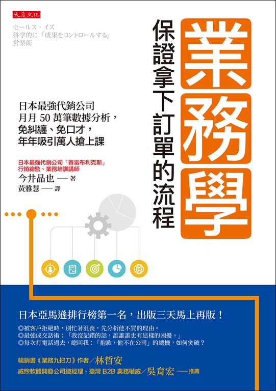 內容簡介 日本亞馬遜排行榜第一名,出版三天馬上再版!每年1萬5,000人搶著學,課程價值50萬日圓的業務技巧◎被客戶拒絕時,別忙著沮喪,先分析他不買的理由。 ◎我的最強成交話術:「我沒記錯的話,誰誰誰也有這樣的困擾。」 ◎每次打電話過去,總回我:「抱歉,他不在公司」的總機,如何突破?本書作者今井晶也,是日本最強代銷公司「賽雷布利克斯」的行銷總監,社內約有500名業務員,每天會透過50到100通的電訪幫客戶賣東西。從摸得到的實體商品、到看不見的服務,從一次性消費到月付型的定期採購。 因此,一個月至少能取得50萬筆成交大數據。透過這筆龐大的數據分析,銷售就無須死纏爛打,能從科學的角度,找出客戶為什麼想買、為什麼不買、猶豫什麼、如何破冰、甚至成交。本書便是根據這些數據,整理出保證拿下訂單的標準流程。◎銷售不能死纏爛打,我用事實說話 業務得有好口才?作者擔任業務員期間,從不說服對方,只拿過往成功案例。 然後適時補上一句:「我沒記錯的話,誰誰誰也有跟你一樣的的困擾。」 萬一還是被拒絕?這很正常, 關鍵是你要問出他「不買的理由」然後修正。 ◎頂尖業務都很重視的基本功 菜鳥業務會拚命吹噓:「本產品榮獲○○獎」、「品質保障」,這樣說客戶不會理;老業務會先拍馬屁、對方說東你不敢往西,但這招只在老客戶身上管用。 頂尖業務只思考兩個問題: 「我的產品能解決客戶什麼問題?」「客戶買了這商品,能得到什麼好處?」 最糟業務呢?他們會為了刷存在感,出現一堆NG言行(書中檢核表)。 ◎年年吸引萬人搶上課的推廣流程作者獨創三二一客戶分析法,寫出來的報告「比客戶自己還了解自己」, 再搭配策略性破冰技巧,遇上任何個性的人都能跟他聊不停。(本書提供完整圖解示範) 越來越多客戶居家上班,要如何約見面談?作者有成功約訪的最強450字, 打電話到客戶公司,老遇到「抱歉,他不在公司」這種總機,要如何突破? 客戶有意願了,但就是做不了決定?頂尖業務如何跟催,這是成交的最後一哩路。 日本最強代銷公司的月月50萬筆大數據分析, 從科學角度,找出保證拿下訂單的標準流程。