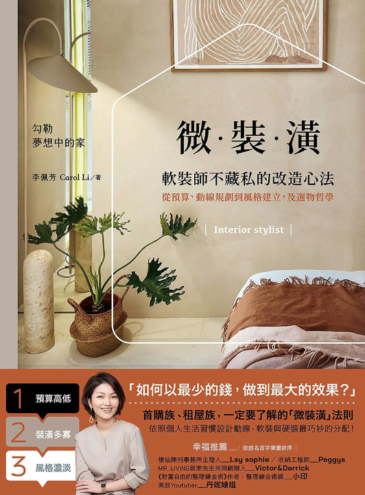 產品目錄 CHAPTER1:認清需要、想要與必要----家的雛形,這樣塑造01勾勒夢想家的藍圖─定義微裝潢的範疇。了解微裝潢的三大重點POINT❶裝潢多寡/POINT❷預算高低/POINT❸風格濃淡02裝潢不只是美化,而是建立一種生活方式。家的機能規劃,首要改變「困擾你的生活模式」03若完全不裝潢,只靠家具裝飾可行嗎?一種裝潢到底可以撐多久時間不會膩?04可以只請設計師出圖,另外發包施工、自己進行監工嗎?情況❶找統包,甚至自己分頭發包、監工,單純請設計師出圖。情況❷把某幾個工種拆給親戚朋友來施工?情況❸可是我沒有要做什麼「設計」啊!05裝潢布置找幫手,記得請對人!布置師、室內造型師,與售前宅妝師的差異?❶布置師/❷室內造型師/❸售前宅妝師06機能已滿足的情況下,那些是必需的硬體裝修?天花板:一定要用木工包覆起來藏線路嗎?廚房:流程動線、檯面深度、高度,如何規劃最好用?浴室:浴室翻新基本要十萬起跳,一定要做嗎?系統櫃:系統櫃有很多優點,所以要做好、做滿?!07硬裝完成後,如何從空屋變成有「家」的味道。家的氛圍基本三大元素:植栽、燈光、壁飾&織品08關於預售屋客變,你該知道的大小事。不走冤枉路!六大客變前必讀重點POINT❶房門很醜,退掉再重做好嗎?POINT❷大門跟廚具的門片不喜歡要退嗎?POINT❸插座是否多做一些比較好?POINT❹需要另外新增220V的插座嗎?POINT❺隔間牆先全退掉再讓設計公司做起來,可以省下拆除與清運費?POINT❻浴缸要不要退掉?09有效搜集、過濾適合自宅的素材:幫自家把把脈。10如何配置客廳與餐廳的動線才流暢?客廳:依照坪數大小,先將空間區分為小、中、大,三種類型餐廳:餐桌、餐椅挑選該注意的重點POINT❶木質餐桌/POINT❷大理石餐桌/POINT❸人造石餐桌/POINT❹玻璃與陶板餐桌最方便的廚房規劃模式11關於休息與收納的地方:不同臥房規劃的原則。主臥規劃次臥規劃書房規劃更衣室規劃儲物間規劃客房、遊戲室,一房多用的機動空間12做了不會後悔的決定Musthavelist。List❶廚下式濾水器List❷大門電子指紋鎖List❸三合一暖風扇List❹掃地機器人List❺浴室鏡櫃List❻吊扇13冷靜評估!避免雞肋的多餘設計。乾溼分離壁掛電視升降桌伸縮餐桌窗邊的臥榻天花板收納廚房的隔間玻璃門14居家裝潢的各種兩難選擇題。窗簾遇到窗台,該如何選擇款式?櫃體做高還是做矮?空間感和收納度如何抉擇?開放式收納櫃怕灰塵、全封閉又怕難找、有壓迫感?衣帽間也要選開放式嗎?不會堆積灰塵嗎?15不藏私的空間視覺放大術。找出一個主角撐著氣場,其餘的配角才是中小尺寸放上腳踏墊或地毯,才能讓空間變完整?不讓空間一眼看完:善用隔間簾、活動格子櫃視線所及之處都有小燈延伸開闊度,讓空間沒有暗角45度角擺放家具視覺更靈活、動線更流暢油漆刷半腰牆,讓視覺有1 3~1 2的留白運用懸空不落地,或有腳的家具能延伸穿透16關於地板,該選磁磚還是木紋好?以視覺溫度來挑選適合自己的地板磁磚/天然石材、薄板磚、板岩磚/類水泥材質/超耐磨地板/免膠地板/石塑地板/塑膠地板PVC17預算永遠是大難題:依照空間條件抓數字。空間條件的分析:新成屋、中古屋、老屋舊翻新的費用,往往花在「表面」看不出來的地方預計入住的時間:5年、10年、10年以上,將影響硬體施作比例18硬裝與軟裝,哪個更重要?裝潢必看三大準則!理性思考,所有需求一定要一次到位嗎?如何運用有限的成本,創造出最大效益的方法裝潢預算是你期望數字的1.5倍!19分析裝潢時的執行方式,對症下藥、事半功倍。室內設計師的使用說明書1.認清事實:裝修本質上就是一件很累的事2.過程中一定會有大大小小的狀況3.如何與設計師攜手過關斬將?設計師的真正工作是:協助、引導、落實、改善CHAPTER2:自家風格----跳脫樣版屋的美學與設計1各大色調基本認識,不再只有制式的單一風格!不同色系帶有不同個性:明度高低、彩度高低繁複度:裝飾程度的多寡勾選出你的偏好,是喜歡明亮或沉穩?2依照使用者習慣、喜好氛圍做刪去法。如何找出更貼近自己偏愛的路線?3當代風格與歷代的風格,你欣賞哪個?北歐風與日系無印風細節上的差異4色彩、材質才是營造空間氛圍的關鍵。讓空間巧妙放大的選色技巧:小空間可以使用深色嗎?POINT❶大地色搭配局部黑色,質感大提升POINT❷選擇同色調或白色系,一點也不無趣POINT❸讓人印象深刻的對比色POINT❹跳色的用法與觀點POINT❺天花板適合刷色嗎?5不可忽視的色彩細節,大幅提升質感。衣櫃內的衣架樣式統一布質或藤編取代塑膠收納籃開關插座面板的替換減少腳踏墊的使用不要把抱枕放在沙發的頂端廚房與浴室的五金、配件,記得統一顏色CHAPTER3:案例分享屬於他們的療癒空間CASE01輕快明亮----公主先生美睫店CASE02簡約基底----Carol的新家CASE03極致裝飾----丹妮婊姐的復古魂CASE04復古時光----強大收納的懷舊風CASE05精緻幹練----機能完整的單人套房CASE06沉穩氛圍----一家的溫馨時刻CASE07奢華簡約----質感女子的放鬆空間Column營造療癒感空間的訣竅CHAPTER4:Carol的選物哲學1不可不知的名家大師。設計名師的經典作品Column所謂「復刻家具」的本意是什麼?2善用經典混搭平價的原創商品。你知道自己購買的是原創商品還是仿冒品嗎?3平價到高價的混搭王道、運用亮點提升空間質感。平價推薦品牌復古老件推薦品牌其他特色推薦品牌推薦家飾品牌推薦香氛品牌