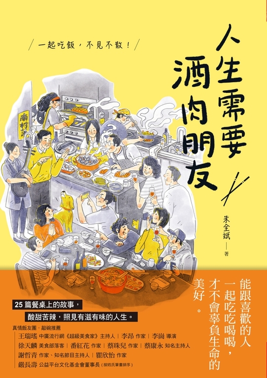 內容簡介 BV宣傳影片 : https: youtu.be 838T_rrfogk能跟喜歡的人一起吃吃喝喝,才不會辜負生命的美好。大人餐桌上的情感學,生活過不去的苦悶、值得歡慶的喜悅,都以好友、好菜、好氣氛來獲得新生的能量!職場的怨氣、家庭的愛恨、人生的迷惘……,許多時候,我們無法跟家人說的愁苦,卻能從與朋友相聚得到慰藉。一起吃飯是日常與他人連結的最好途徑,彼此陪伴分享心情,入口的是佳餚,化在心裡的是情分。餐桌上的溫度,是愛與被愛。而這本書的起心動念,也是以愛為名。作者朱全斌之所以寫這本書,源起於知名的美食作家妻子韓良露結束人間的旅程前,放心不下地交代他:「你要有一起吃飯的人。」他在妻子走後,原本覺得失去對食物的味覺,意興闌珊,沒想到不論舊雨新知,從閨蜜、知交、學生、旅伴到老同學,紛紛主動送來食物或邀他聚餐,甚至煮飯給他吃。在大家的熱情催動下,他不僅逐漸恢復對食物的興致,更因濃濃的溫情而撼動內心。他體會到在人生孤獨的旅程中,尤其到了暮秋之際,必須有三五飯友一起吃喝,加深情感交流,替日常留下暖心的記憶。他在書中細數從童年、青壯年到成熟大人一幕幕「美好食光」,藉此傳遞因為有食物與人的故事參雜,生命變得更豐厚更有餘韻:孩童時期,母親十八般武藝滿足全家人的家傳菜;留學生時代,已出過幾本小說的學姊李昂親自下廚,年輕學弟妹卻不懂得作客之道;李崗的春宴澎湃專業,甚至還促成作家舒國治的姻緣;邀約好友共聚一堂,在妻子走後為她辦壽宴,遙想既愛吃也喜歡朋友的妻子在天上依然可以感受到愛與思念……。25篇餐桌上的故事 x插畫家Croter精心繪製插圖,酸甜苦辣,照見有滋有味的人生。真情飯友團.敲碗推薦中廣流行網《超級美食家》主持人王瑞瑤作家李昂導演李崗美食部落客徐天麟作家番紅花作家蔡珠兒知名主持人蔡康永作家、知名節目主持人謝哲青作家瞿欣怡公益平台文化基金會董事長嚴長壽(按姓氏筆畫排序)真情分享 「韓良露病逝後,可以說是藉著『南村落』朋友經常性的聚會,而聚會的重頭戲是共同做菜、朋友歡聚,飲食成了療癒走過傷痛的方法之一。我也參與過南村落的一些聚會,真正感覺到朱全斌在書中所說的,有好的相伴者吃飯,才真的是餐會最大的歡聚。」——作家 李昂「這本書有很多盛饌美味,但更重要也最可口的,永遠不是吃,是人。」——作家 蔡珠兒「無論是對料理五感體驗的文雅食趣,或是陳述食物記憶的貪饞甜蜜,在在都顯示出,全斌老師對生活與食物的獨到見解與熱愛。更進一步讓我重新戀上一起吃飯、一夥聊天的快意幸福。」——作家、知名節目主持人 謝哲青「此書帶給我最大的感動在滿滿的人情味。與人相交以共食為樂,我看到了認真吃飯的男人,對生活周遭的高度關注,活出了令人稱羡的小日子。」——中廣流行網《超級美食家》主持人 王瑞瑤「斌哥的手路菜是他江西老家的粉蒸肉,一桌酒菜如果只有龍蝦鮑魚而沒有粉蒸肉會很怪,就像講相聲只有逗哏,沒有捧哏,儘管演出者説學逗唱得再精釆,觀眾仍會覺得被壓迫得沒了想像空間。斌哥就像粉蒸肉那麼的讓人舒服……。」——導演 李崗「我們從小到大在不同的地方、跟各種不同的對象,都能有許多餐桌上喜怒哀樂的回憶,這樣精彩的吃飯記憶,都在朱老師的新書《人生需要酒肉朋友》裡頭。」——美食部落客 徐天麟「從兒時到人生的暮秋,從東方到西方,從兩個人轉回到如今的一個人,朱全斌將他數十年豐富、溫暖、趣致的飲食經驗娓娓道來,精彩而深刻。」——作家 番紅花「直到讀了這本《人生需要酒肉朋友》,才更加知道吃飯對朱全斌的意義,遠超過餐桌上的美食佳餚,他更看重的,是朋友間的深厚情誼,難怪他永遠是最溫暖大方的主人。」——作家 瞿欣怡