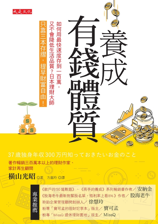 內容簡介 根據人力銀行最新統計,臺灣39歲以下族群, 個人名下總存款,平均只有13.3萬元,甚至有超過兩成的人,零積蓄。 ◎住公司附近,省通勤費但房租高;跟上班通勤但住家遠,你怎麼選? ◎投資自己很重要,所以買了健身課程、高爾夫球課……其實這些最容易浪費錢。 ◎「請問你,昨天一共花了多少錢?」你只能大概、還是能精確回答? 薪水永遠追不上物價,我還有可能提早財富自由嗎? 當然,只要你現在開始培養「有錢體質」。 作者橫山光昭學的是會計,卻被公司派到門市當業務, 因此他只待了幾年就離職,準備代書考試。 當時的他才25歲,有兩個小孩要養,家裡卻只有他一份薪水。 這樣很難存錢?錯,他利用自創的家計三分法、靠三本存摺, 從跟人借錢來準備創業,到37歲不到就存到第一桶金, 更成為日本累積銷量達300萬本以上的作家和理財顧問, 幫助超過23,000個家庭,從月月赤字,變年年有餘。 ◎家計三分法,爽花5%照樣能存錢 「你昨天花了多少錢?」很多人根本答不出來,因為你沒有記。有錢體質的關鍵是:記住自己花了多少錢,但千萬不要每筆花費都記,更不要從最複雜的伙食費開始,因為這是許多人記帳失敗的關鍵。按照作者自創的消、浪、投──家計三分法記帳, 每個月除了固定的生活費,還能允許自己有5%爽爽花,照樣存大錢。 ◎有錢人必備三本存摺 變有錢的第一步,你要有三本存摺:日用摺:放每個月的日常開銷,最少要存放1.5個月生活費。儲蓄摺:薪水一入帳,馬上轉1 6薪水到這本存摺,且至少要放6個月生活費。理財摺:這裡面不要放現金,而是股票或基金。猜猜看,哪本存摺不要天天看?作者已持續這樣操作19年,累積的投資報酬率已達6%以上! ◎跟你的父母、子女、另一半,談錢結婚和單身,哪個比較花錢?買房和租房,哪個划算?網路上最常討論的兩個大哉問,日本最強理財大師親自算給你看。要存多少錢才夠退休生活?只靠健保不要其他保險可以嗎?其實,有三種情況根本不需要買人壽險。 許多家庭的家計破口,在於這兩種投資:孩子的補習和才藝, 如何用最快速度存到100萬,又不會降低生活品質? 日本理財大師教你具體實踐,提早實現財富自由!
