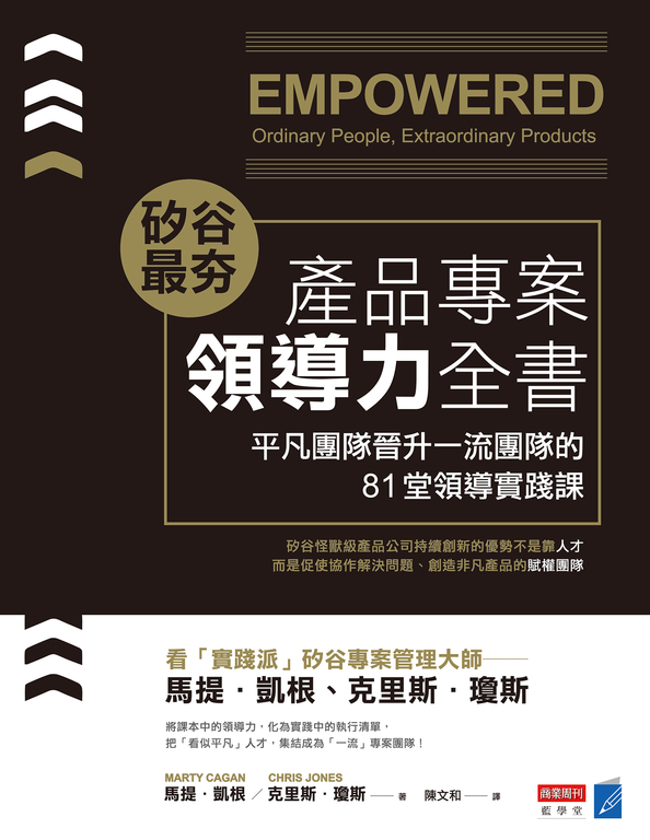 作者介紹 馬提.凱根(MARTY CAGAN)矽谷產品團隊(Silicon Valley Product Group)創辦人,向領導業界的科技公司分享高階主管經驗。他是深受歡迎的演說家、顧問、作家和企業主管教練。在創始矽谷產品團隊之前,凱根曾擔任惠普、網景、eBay等全球各地最成功企業的產品主管。著有暢銷書《矽谷最夯‧產品專案管理全書:專案管理大師教你用可實踐的流程打造人人都喜歡的產品》(商業周刊出版)。克里斯.瓊斯(CHRIS JONES)瓊斯歷任資安公司Lookout、賽門鐵克(Symantec)、資料外洩防護商Vontu等產品開發團隊組建者和領導者,逾25年間界定了多個新產品種類。他擁有多項專利權,並在消費商品、企業行動裝置、網路、資料和平台服務等領域研發過眾多新產品。自加入矽谷產品團隊後,瓊斯直接合作的企業從新創公司以至《財星》五百大公司達上百家,這些公司廣泛涵蓋各式科技、各類商業模式與各種產業。