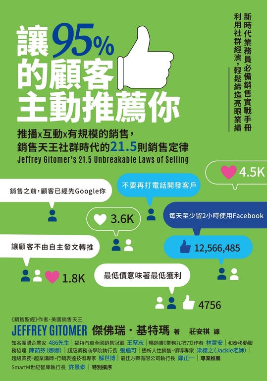 內容簡介 ☆ 公司雜誌(Inc.)最佳銷售書籍☆《華爾街日報》暢銷書、《富比士雜誌》專文推薦☆ 亞馬遜網路書店讀者4.5顆星推薦低價競爭、勤奮聯絡不保證順利成交,透過社群超前部署,成為價值提供者,讓顧客帶來更多顧客!新時代業務員必備銷售實戰手冊利用社群經濟,輕鬆締造亮眼業績有些同事不常主動聯絡客戶,業績怎麼總是超前達標?想把好東西推薦給顧客,卻老是吃閉門羹,如何改變被拒絕的命運?該怎麼留言、怎麼傳訊息,才不會顯得咄咄逼人?☆ 不要再打電話開發客戶 ☆ 銷售之前,顧客已經先Google你 ☆☆ 每天至少留2小時使用facebook ☆ 讓顧客不由自主發文轉推 ☆☆ 最低價意味著最低獲利 ☆每個銷售員都期待業績長紅,與客戶約時間、提案到成交卻總是阻礙重重。創建業務培訓帝國的銷售天王傑佛瑞.基特碼濃縮40年的業界精華,歸納出21.5則銷售定律,只要利用社群推播對顧客而言有價值的資訊,透過舊有顧客的推薦打響個人品牌、累積信任,有意願的潛在客戶就會主動來電,95%的成交不請自來。你也許已經注意到,在人手一機的時代,顧客已經變得不同:• 他們放慢做決定的速度,可能猶豫了一年以上——你該讓自己輕易就被Google到。• 他們熟悉產品,比你更了解你的競爭對手——別再談產品,而是談顧客所在產業的業務訊息,讓顧客喜歡你的打擾。• 他們無時無刻不透過社群軟體告訴全世界自己遇上什麼事——你必須提供令人驚喜的服務,讓顧客不由自主發文、轉推,成為你最好的行銷工具。• 他們早就Google 過你的價格和服務——經營好個人品牌的FB、IG或Youtube頻道,維持好聲譽。• 他們想要的是一段人際關係,期待在售後得到優秀的服務——好好提案,問對問題,完成交易而非結束交易。熱愛自己的工作,人們就會被你吸引。在正式與你互動前,顧客就已決定要購買。95%的成交率並不困難,只要每天花2小時經營社群媒體。讓社群替你說話,你只需要等電話響起,然後完成交易,輕鬆成為超級業務員。業界講師、在線超業一致推薦美國銷售之神40年執業精華三十年前我剛踏入銷售職場,跟大家一樣努力開發客戶,你想得到的方法,我都努力過,而且做得很不錯。但這麼努力還是離超業太遙遠。我想通了一個道理:「與其我很用力開發客戶,何不讓客戶好奇我、想認識我!」想在銷售路上做得出色?《讓95%的顧客主動推薦你》能給你許多啟發與省思,讓你的努力事半功倍。──超級業務、超業講師、行銷表達技術專家 解世博本書的作者Jeffrey Gitomer無疑是當代的銷售大師,很榮幸有這個機會推薦大師的經典著作。書中以淺顯易懂又切中肯綮的文字,揭示銷售的心法及方法,心法是恆常不變的定律,方法是與時俱進的利器,在今日網路暢通、資訊發達的時代,善用社群媒體的力量,絕對能幫助每一位讀者,再創業務職涯的佳績。──透析人性銷售、領導專家 梁櫰之(Jackie老師)在這個網路社群的年代,你需要打造一條讓顧客能快速找到你的捷徑,並且成為社群最被信任的人,讓滿意的顧客成為你最忠實的推廣者。而這其中最關鍵的一項技能,就是讓大部分的顧客都願意主動推薦你的能力。如果你也想要學會這個技能的話,這本書絕對不會讓你失望的!──超級業務商學院執行長 張邁可無論你是業務新手還是資深好手,你的銷售方式需要與時俱進,讓客戶知道你,想到你,主動找你,美國銷售之神將告訴你可以怎麼做。所有你該知道的頂級銷售心法和實用做法一次滿足,非常有效,同時我也在使用。──暢銷書《業務九把刀》作者 林哲安(原書名為《讓95%的顧客主動推薦你:社群時代銷售之神不敗的21.5則定律》)