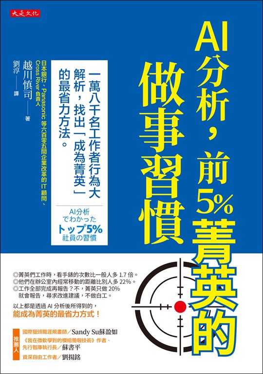 內容簡介 ◎菁英們工作時,看手錶的次數比一般人多1.7倍。◎他們在辦公室內經常移動的距離比別人多22%。◎工作全部完成再報告?不,菁英只做20%就會報告,尋求改進建議不做白工。◎「我們一起試試看吧」,這是他們面對困難時的口頭禪。以上都是透過AI 分析後所得到的:前5%菁英的做事習慣。 作者越川慎司曾是美國微軟總公司的業務執行主管,目前擔任Cross River執行長,運用AI數據分析,協助605間企業進行工作流程大改造,客戶包括日本Panasonic、索尼、日立等大型企業,還有日本總務省、經濟產業省等政府組織。 為了了解那些在職場裡,表現傑出的人和表現平平的人到底哪裡不一樣,他特別挑出25間大企業,樣本數共計18,000人,調查了其中5%菁英與另外95%一般員工的工作方式。 他在這群人的桌面上設置固定攝影機,請他們穿戴IC記錄器與感應器,透過雲端服務與面對面的訪談,記錄他們的行動與發言。 還分析他們的郵件內容,蒐集通訊軟體與線上會議的使用紀錄,交由大數據分析後,整理出菁英們工作時的共通點,與一般員工的差異。納出「我也能成為菁英」的最省力方式!◎一般員工都誤以為,這樣做會得到主管讚賞: 經常加班,電腦旁貼滿待辦事項,看起來非常非常忙碌;頻繁的檢查郵件,所有信件都立即回覆,感覺非常有效率;以為網路上可以找到所有資訊,並花大量時間準備看起來很重要的資料,所以每回提出的簡報頁數總比菁英多32%;因為他們誤以為,把很多工作「做完了」,就是「做好了」。 ◎前5%菁英其實都是這樣想事情: 他們蒐集到六成情報,就開始行動,而且在工作完成20%時就尋求建議,所以他們在企業內移動的距離比別人多22%,因為不斷在找重要的人晤談。 菁英們會不斷拋出自己的點子,在會議中發言次數比別人多22%,而且他們不怕做決定,不怕扛責任,能力也許不是最優,但經常是老闆口中「他是我最放心的人」。還有,他們必做三種準備,不做三種損耗。(詳見本書第二章)◎菁英這樣說話,讓自己很快被看見: 他們跟同事搭話時,先問「可以借用你一點時間嗎?」表達自己的立場時,要說「或許是那樣,但我是這麼想的……。」行動時,記得表現出團隊感:「我們一起試試看吧!」他們隨時把「真棒」、「你真厲害」掛嘴邊,所以在辦公室裡,他們露出笑容的機率比別人多1.4倍。想跟這群人一樣優秀,很難嗎?一點也不。作者還提出幾項你現在就能做的改變,其中最簡單的就是「不要一個人吃午餐」,這是「成為菁英」的最省力方法。