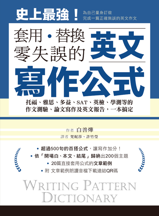 內容簡介 文章開頭要怎麼「破題」?!要如何「組織論述」?!又要如何「下結論」?!不必絞盡腦汁怎麼寫,只要會「套用」再「替換」就行!超過 500 句的百搭公式英文句,供你隨查隨用!依「開場白、本文、結論」歸納出 200 個主題 + 20 篇文章範例,讓你快速找到符合主題的用詞,免思考立刻套用,迅速完成一篇正確無誤又高分的英文作文!不論是考托福、雅思等作文測驗,還是寫論文、報告,各種體裁都能在時限內,寫出能「搶分、加分」的文章!遇到寫作,腦袋為何總是一片空白?你是否讀了太多講「理論」的英文寫作書?市面上許多英文寫作的書籍,大多都會講到寫作架構、段落邏輯訓練、寫作技巧等等,並整理出一篇篇範例,這些固然是寫作很重要的邏輯組織方法,但太過複雜的理論或技巧,常會讓讀者在真正要下筆時,遇上不知該寫什麼的困境,主要是因為書中提到的引導式寫作理論,大多是配合書中的範例文章,但列舉的範例文章篇幅有限,不足以套用到各類寫作,當你特別想用時下的熱門話題,或是想引用生活中的故事等來切入主題時,雖然明明很有想法,卻卡在不知該用什麼樣的英文句子來引導或鋪陳。老是卡在第一句?直接套用公式比學一堆理論更實際!許多人在寫作時,一開始都會習慣先架構好在開場白、本文與結論中要談的內容大綱,但真的要下筆時,就會面臨到第一句要寫什麼、主題句要寫什麼的困境。不論你對寫作架構是否已經有概念,還是單純只有想法卻沒有概念,只要用本書找到當下適合切入該主題的句子,就能寫作。本書直接列出你在開場白、鋪陳本文與結論可以用的多個套用公式。*起頭可用的套用公式.如果想在開場白的部分用「引用生活中的故事」來起頭,你可以用:We often hear that ...(我們常聽說…)It is often said that ...(常言道…).如果想要「陳述一般大眾錯誤的觀念」來作為起頭,你可以用:Most people consider ...(大部分的人認為…)One of the misconceptions about ... is ...(對…錯誤的認知之一是…)*在本文中可用的套用公式.如果想用「令人感興趣的話題」來鋪陳時,你可以用:Much more interesting is ...(更有趣的是…)Of even greater appeal is ...(…更具吸引力)*在結論中可用的套用公式.除了以往用「Therefore」「In conclusion」等的詞彙來引導作結,你還可以用其他方式來下結論:【點出原因與結果的作結方式】This leads us to believe that ...(這讓我們相信…)On that account, ...(由於這緣故,…)【提出解決方案的作結方式】There is much to be done ...(…要做的事還很多)Perhaps it is time to ...(或許是時候…)*收錄各類文章寫作中都會用到的表達除了以上供你套用、做替換的句型之外,本書也收錄寫作時必然會用到的基本要素,像是「因果關係」的表達、「兩者比較」「轉換話題」「對照」「依序列舉要點」等等十分常用的表達。像是要做兩者對比、對照時,你可以用到 In contrast,(相較之下)、On the contrary,(而是)、Conversely,(相反地)等來增加語氣的轉折,同時有助於強化自己的論述。*解決用字遣詞不再單調的問題本書中的公式除了可拿來作句型的套用之外,還能解決你在寫作時很忌諱的文字重複問題。要是你會的單字有限,要表達「此外」卻只知道重複使用「Besides」或「In addition」,那麼整篇文章閱讀起來會缺乏豐富度、單調無味。有了本書,當你要「補充說明」時,除了使用「Besides」或「In addition」,你還有 What is more、And that’s not all、Also 等超過 10 種的用字選擇,讓你的用字遣詞不再單調,讓閱卷人員或論文教授都對你留下絕佳印象。同時涵蓋「套公式快速安全搶分」與「仔細研讀提升寫作實力」的兩大需求!★ 200 大主題,寫作中各種想表達的用詞通包涵蓋「開場白、本文鋪陳及結論」各部分之 200 種主題、500 多句可套用的句型公式,大量收錄起承轉合的各種組織用詞,讓你在沒有頭緒時,直接參照本書找到符合文章調性的用詞表達,並迅速引用。★ 便於查找的主題,讓你快速找到適合的用詞假如你正要寫本文的論述,卻不知該怎麼點出話題時,你可以在「打開話題」的這個主題中,用「To begin with,(首先)」、「The task at hand is to ...(現在首先要做的是)」或「We must first examine ...(我們必須要先檢視)」等句型。此外,想要表達像是「原因、結果」「兩者比較」「提及特定觀點」「轉換話題」「對照」「依序列舉要點」等在寫作中十分常用的要素,本書也通通都有收錄。★ 附上使用時機的說明、例句,套用公式不只是理解意思,還能掌握用法本書的每個句型公式皆附上中文翻譯、用法說明以及三句例句,讓你在寫作時精準應用。★ 20篇範例文章,讓你融會貫通寫作技巧本書在後面第二部分會針對不同的作文題目,整理出20篇範例文章。不只是列出範例而已,首先會教你組織大綱架構,用幾個重點列出在開場白、本文發展及結論中要寫的內容。接著再利用前面第一部分學到的句型公式,完成一篇完整的作文,並用顯眼的顏色標示其句型,讓你徹底搞懂一篇文章的脈絡及組織邏輯,同時學會使用本書的公式。 ★ 額外附上範例文章朗讀音檔之QR 碼線上音檔,沒有光碟播放器也能練習針對本書後面第二部分的 20 篇範例文章,我們有特別製作線上朗讀音檔,並提供讀者可一次下載全書 MP3的 QR 碼,不需註冊會員,或額外安裝自己不熟悉的播放 APP,省去每次聽音檔都要掃描的麻煩!(註:由於iOS系統對檔案下載的