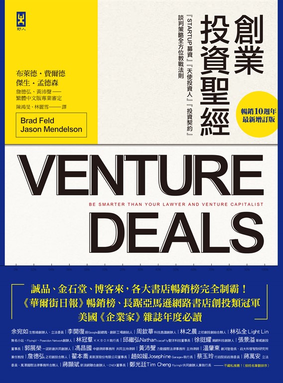 內容簡介 正是這套夢幻法則,造就矽谷成為創業家與投資家的天堂樂園!\Twitter 前CEO 迪克‧科斯特洛:「我創業的時候怎麼會沒有這本書呢?」/ ☆誠品、金石堂、博客來,各大書店暢銷榜完全制霸! ☆《華爾街日報》暢銷榜、長踞亞馬遜網路書店創投類冠軍 ☆美國《企業家》雜誌年度必讀 增訂六個全新章節! 詳解股權結構表、探討群眾募資需要注意什麼法律問題,股權該如何分配?建議何時該讓創投銀行介入、解析條件書的必要與重要性……豐富內容不藏私全公開! 原始章節大幅修訂新增即時資訊! 繁體中文版 獨家加注台灣「在地觀點」! 作者布萊德.費爾德與傑生.孟德森 以近30年、數百次參與創業投資的經驗,傳授給讀者: 撰寫投資條件書的藝術 討論參與創業投資各個面向的參與者 如何融資並了解投資協議的具體條款 融資時的談判技巧、法律問題 以及所有創業者、投資人應該知道並熟記的所有知識與技巧…… 本書從創業投資條件最簡單的來龍去脈說起,先介紹參與創投交易的各方人馬。 接著談到如何籌錢,包括判斷「應該籌多少錢」,還有踏上籌資道路之前,需要哪些東西。這部分會講到許多創投人士決定投資時所遵照的程序。 再來是深入創投投資條件的細項,此處分成三章:「牟利的條件、控制權的條件、其餘條件」。我們在細項條件,力求觀點平衡,加上策略的輔佐,以圖公道地做生意。 後續會談到條件,有談「可轉換證券的方法」,再公開「創投商人的手法」,包含動機和報酬;接著會討論現實結構面如何影響一家公司籌資成敗,或在投資作成事後影響「創投人士、創投廠商、創業人士」三者的關係。 本書會初步講到談判,及特定策略在創投界是加分還是扣分,因為這在募資的過程中至關重要。我們也有意幫創業人士避免常見的錯誤或圈套,同時圓滿完成創投融資的交易。 世上沒有所謂標準的創投融資,各項議題會考量公司不同階段籌資納入考量。 本書特別用一章是講創業人士要知道的其他重要投資條件:向你收購公司的合同意向書。 最後以數個新創公司大多會面臨到的法律層面問題作結。本書也許沒辦法像論文那樣洋洋灑灑,羅列所有創業須知,不過已納入數個作者認為創業理當注意的重點。 ★新創的世界瞬息萬變,初版已是必讀聖經,二版新增逾八萬字內容,完整抓住趨勢脈動,趁勝追擊,擴大公司規模!★