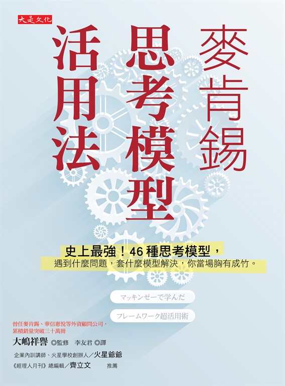 內容簡介 日本超過30萬上班族,案頭必備思考工具書。◎找6個人,花30分鐘,就可創造100個新點子,這是腦力書寫法。◎聽過曼陀羅九宮格嗎?職棒二刀流大谷翔平就用這方法,讓自己變一流。◎老闆突然要我交報告,怎麼寫才能又快又好?套用模型。監修者大嶋祥譽,曾任職麥肯錫、華信惠悅(Watson Wyatt)等外資顧問公司,她認為,大環境變化越來越快,工作者能應變的時間越來越短,此時,更需要思考模型,幫忙解決問題。什麼是模型?模型就像定石,類似在圍棋中,經過棋手們長久的經驗累積,形成在某些情況下,雙方都會依循的固定下法。思考模型就是前人想出的商務最佳方案,也可稱其為公式,只要套用,便能迅速而精確的下決策和解決問題。本書包含46種麥肯錫員工最常使用的基本模型,從邏輯思考、構思點子、解決問題、行銷到組織管理,全書圖解,遇到什麼問題,該套什麼模型解決,你立刻胸有成竹。 ◎七種思維模型,想法多到用不完腦力書寫法,只要找到六個人就能在30分鐘內想出破百個點子 KJ法,將資訊分類三次,新點子自動浮現瞬間誕生這麼多想法,怎麼評估? 優缺點表、報酬矩陣、決策矩陣,可以幫你找到答案。◎行銷策略模型,競爭對手連你的車尾燈都看不到 PEST分析、五力分析、3C分析、行銷組合、人物誌、客戶體驗旅程 建立品牌價值、核心能力分析,就能找出對手無法模仿的核心優勢。 ◎光碎念沒用,這些模型讓團隊自己動起來部屬工作效率差,得用馬斯洛需求層次理論;想培訓領導者,PM理論最好用;怎麼做目標管理?KPI樹狀圖,能釐清流程和進度。還有,SWOT分析、價值鏈分析、產品組合管理、安索夫成長矩陣、柏拉圖法則、產品組合管理、定位圖,史上最強46種思考模型,遇到什麼問題就套用,馬上導出最高成果。