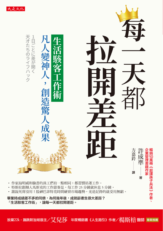 產品目錄 推薦序 一個人是如何漸漸與人拉開差距的?/艾兒莎前言 每天細微的改變,創造巨大變化第一章 專注就有力量,任何場合都一樣01每個人的一天都是24小時02午餐減量,腦子更靈光03簡化生活中的所有選擇04原來,海明威站著寫作05先抓脈絡,不要蒙著頭馬上做06以「每5分鐘為單位」的時間管理術07把「每一次」都當最後一次力拚08有時候,吵鬧環境讓人更專心09一整天的理想使用方式 10蘋果設計師,邊聽音樂邊工作11厲害的人都有一些怪癖 12遇到低級錯誤別沮喪,抗生素是這樣發明的 第二章 創意不是天生,高手這樣訓練01日本首富的5分鐘創意發想02好萊塢大導演的創意劇本 03賣翻全球的哈利波特是靠色筆寫出來的04高手,永遠比別人多想兩年 05別沮喪,反正你也沒什麼好失去的06找一件事,天天做07孩子的玩具不只是玩具08沒有靈感時,就去散步吧!09容易被感動的人,才能創造感動10有時間抱怨,不如說說自己的夢想吧!11把力氣花在「如何被看見」12受歡迎的祕密,都在經典裡13流行也可以套公式第三章 每一天都拉開差距的技巧01只有家人會跟你說實話02你要努力,但不能光靠努力 03入睡前先思考隔天的工作排程04覺得哪裡怪,就要說出來05永遠都要有備案06書不是拿來讀,是拿來用的07簡樸的心態,是假裝不來的08一心多用,效率更好09讀空氣,讓你更有說服力10學會在爭辯中脫身11線索藏在細節裡,只是你沒看見12誰說死背沒用,記住多少就能獲得多少13放大你的優勢,不拿手的就放棄 14詳細記錄工作流程15沒有什麼事情是理所當然16沒有辦公室也能辦公事17一輩子只要做好一件事18谷歌工程師的思考技術19批判性思考,人類進步的動力20只要肯嘗試,絕對不會做白工21敞開心胸,自然能發現捷徑第四章 菁英用這些習慣,戰勝壓力01鈴木一朗的儀式02工作之餘,培養讓自己開心的興趣03有時候,你得用第三者視角跟自己對話04經常跟自己說:「我一定能做到!」05奧運金牌選手的想像力練習 06寫作可以幫你釋放心情07三十分鐘冥想鍛鍊法08我閉上眼睛,以求能看見09樂觀,就是凡事先往壞處想10談判不是比大聲,你得有籌碼11控制負面情緒的最佳方法12聽音樂,而且是重複同一首13學會開自己的玩笑14世上沒有真情流露,背後都是精心彩排15處於劣勢時,如何逆轉勝?第五章 因為學習,所以成功01流程簡單,才能執行02實務經驗比理論更有用03語錄就是天才們的思考精華04大文豪的日記,寫的也都是瑣事而已05就算是天才,也需要激發靈感的好朋友06把困難流程切成簡單步驟,各個擊破07老接受同一種刺激,大腦會退化08每天花15分鐘投資自己09首富靠閱讀,改變全世界10她會16種語言,怎麼辦到?11光知道還不夠,你得會用12李嘉誠怎麼學英文?看電視13讀書可以創造英雄,英雄可以改變歷史14好好對待自己的身體15利用錄影機側拍自己16記錄每一筆小支出17記憶力是可以後天培養的結語 破解生活駭客技巧,人生開外掛