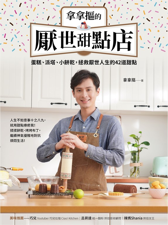 作者介紹 拿拿摳畢業於臺灣藝術大學廣電系,曾經當過幾年的厭世上班族,偶然接觸到甜點工作,開啟了白天上班、晚上學甜點的兩頭燒生活,雖然辛苦,卻也發現對於甜點的熱愛,而走向全職甜點師之路。目前和好友「多多」在臺北南港開了一間叫做「給冷鴿手作甜點」的甜點店,並和學弟大白、Taco經營YouTube頻道「厭世甜點店」,極其厭世的風格,伴隨魔性笑聲的教學,吸引23萬人訂閱(雖然目前距離百點訂閱還差77萬,但持續成長中)。頻道影片雖然娛樂性十足,但製作教學絲毫不馬虎,解說仔細、手把手一一提點,希望讓每個人都能跟著做出好吃的甜點。YouTube:厭世甜點店Instagram:energydessert2019Facebook:厭世甜點店