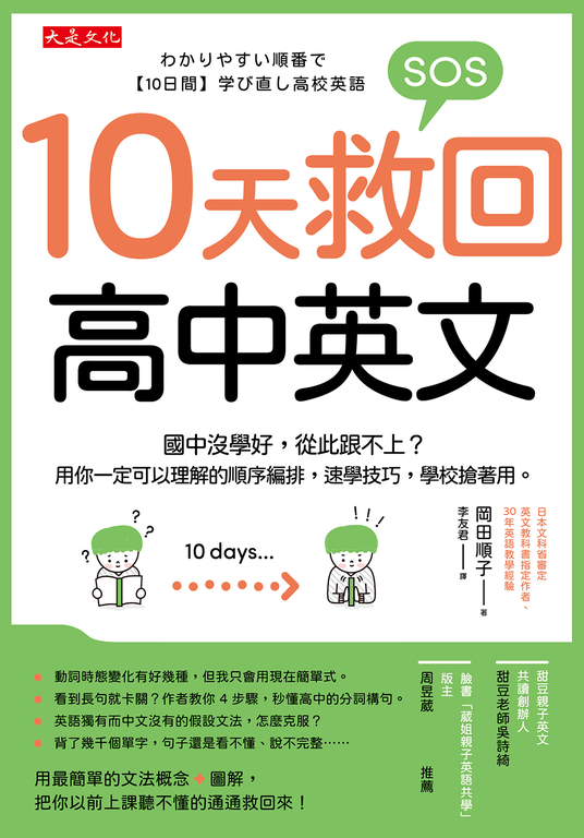 內容簡介 獨創拆解式文法,連學校也搶用! 日本文科省審定英文教科書《EXCEED》指定作者! ◎動詞時態變化有好幾種,但我只會用現在簡單式。 ◎看到長句就卡關?作者教你4步驟,秒懂高中的分詞構句。 ◎英語獨有而中文沒有的假設文法,怎麼克服? ◎背了幾千個單字,句子還是看不懂、說不完整…… 本書作者岡田順子,擔任英文老師超過30年, 也是日本文科省審定教科書指定作者、補習班名師, 因獨創一套10天就能學會,好記、好懂,最不容易忘記的文法速學技巧, 讓許多學生及上班族都說:「我真的重新學會英文了!」 她說,許多人每天苦背單字卡、死記文法&片語,但還是一口菜英文, 關鍵就在:用錯誤的順序學英文。 本書不同於傳統教科書的從頭講起, 教你先學動詞和5大基本句型,接著才是主詞、補語、受詞、修飾語, 以及各種常見句型:被動語態、假設語氣、祈使句、附加問句等。 用最簡單的文法概念 + 圖解,把你上課聽不懂的通通救回來。 ◎第1天,複雜英文,這樣拆解就秒懂:動詞和5大基本句型 一個完整的句子,必定有2大要素:主詞 + 動詞, 再怎麼複雜的英文長句,都可以套用5大基本句型。本書用步驟拆解給你看。 ◎第2天,例句X圖解!速學12種時態變化 現在完成式、現在完成進行式,有何不同? 本書附12時態的圖解和對比例句, 讓你馬上寫出和說出未來完成進行式、過去完成式、未來完成式等時態的英文句子。 ◎第4天,句子主詞這樣找,文法即戰力 英文造句時,首要掌握的是主詞,接著再思考動詞, 所以決定和建立主詞的方法相當重要, 今天的目標是能確實寫出和說出主詞。 不定詞、動名詞、關係代名詞都可以用來當主詞, 本書附不定詞代名詞九宮格圖解,讓你秒懂! ◎第10天,If條件句的假設語氣 假設語氣與分詞構句並列為高中英文的兩大難關, 是英語獨有而中文所沒有的文法,許多人特別容易在此陷入瓶頸。 不用擔心,作者用大白話教會你。 同時收錄超過100 則生活實用例句、實戰練習題, 讓你秒懂最容易混淆的文法概念!