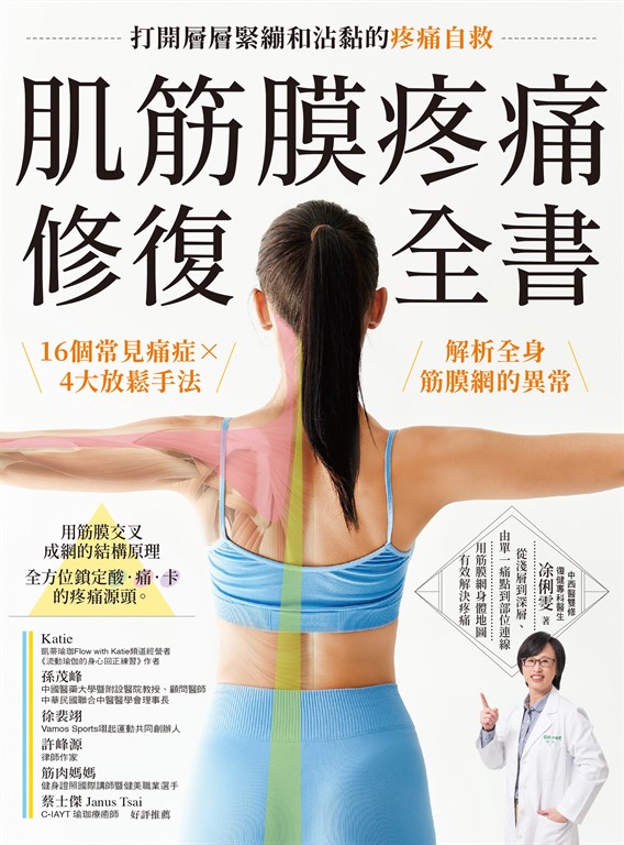 內容簡介 筋膜解痛專家/國家隊隊醫──凃俐雯 醫生 筋膜疼痛概念「全面更新」!最新肌筋膜自我修復提案用全身筋膜網構造原理,精準找到疼痛源頭。最全面的肌筋膜疼痛診斷書,完整解析16個常見疼痛症狀,對症伸展放鬆‧熱敷按壓,讓解痛效果一次到位!▲肩部痠痛、五十肩,可能是腹部的筋膜異常?▲常常腰痛、小腿緊繃,為什麼定期物理治療都好不了?▲用滾筒想放鬆,但是怎麼會愈滾愈痛?▲腰痛、髖卡卡、小腿緊繃?可能是你壓力太大。▲筋膜疼痛,其實不是「緊繃」,而是「卡住」了!▲筋膜要愈鬆愈好?錯!偏頭痛、肩頸痛、五十肩、網球肘、腕隧道症候群、下背痛、跑者膝、退化性關節炎、足底筋膜炎……你想得到的痛症,都和筋膜有關!筋膜疼痛治療的最新修復概念和解痛實作,了解痛症反覆發作、久痛不癒的原因,長期、慢性、急性疼痛的自救全書。【最受運動國手信任的醫師,最新的肌筋膜解痛概念】凃俐雯醫師是國家隊隨隊隊醫、知名中西醫雙修復健專科醫師,結合運動和復健醫學的專業,是許多運動員和運動團隊指定的治療醫師;數年前開始大力推廣「肌筋膜」的概念,以身體結構的原理找到疼痛點,讓一般大眾能更了解自己身上發生疼痛的原因,進一步對症解決。在整理了國外最新的筋膜研究之後,凃醫師帶來最前線的修復概念和解痛實作,解析淺層和深層筋膜的功能,並進一步將肌筋膜造成的疼痛分為五大類別,了解發生疼痛的原因,才能有效對症解痛!除了常見的運動傷害和缺乏活動之外,還有「老化、受傷、重複動作(勞損)」,同時也提到「疤痕沾黏、壓力緊繃、天氣變化」造成的筋膜疼痛,並釐清許多對於筋膜的正確認知:「筋膜疼痛並不是『緊繃』,而是『卡住』了」、「好的筋膜,不等於鬆的筋膜」……等。 【身體的疼痛,都和肌筋膜有關】●肌筋膜是什麼?以最簡單的說法來解釋「筋膜」,就是肌肉周圍和裡面白色的一層薄膜狀物質;這層「膜」把肌肉群和關節等等組織連結在一起,不僅讓人體能順利做出站立、行走、跑跳、扭轉等等動作,也有保護血管和神經正常發揮作用的功能。●為什麼後大腿拉傷,坐骨會痛?人體有七大筋膜,同一條筋膜的張力互通,因此疼痛也會隨著筋膜的路徑傳遞出去,除了受傷的地方疼痛,也可能沿線轉移到其他地方。●沿著筋膜線,不一定能找到痛點!事實上,人體在運作時,力量並不會完全按照筋膜線的路徑走!不同筋膜線之間會交叉重疊,真的痛點可能會是另一條筋膜線上引起的!‧肩頸痠痛→「淺背線」和「淺前線」→兩條筋膜線的張力都失去平衡,讓肩頸壓力增加導致疼痛。‧下背痛‧腰痠→「淺背線」和「功能線」→兩條筋膜都與背部路徑有關,要同時處理。‧膝關節炎→「淺前線」、「淺背線」和「側線」→三條筋膜分別經過連結到膝蓋的肌群,要同時處理。●單一的疼痛點,會沿著全身筋膜線路、影響到其他部位!除了主要的七大筋膜線互相交叉重疊,人體還有許多小筋膜線通過,形成一張包覆人體各個角落的筋膜網,當任何一個角落出現問題,都會影響到整體的張力,讓其他部位出現緊繃、活動力降低的疼痛症狀。筋膜因為各種原因出現異常:增厚(纖維化)、卡卡(緻密化)和沾黏(受傷/手術後疤痕癒合)等等,失去韌性、阻礙肌肉的收縮,不只讓肌肉僵硬,也影響了血液循環,造成了身體各部位痛症的結果。【兩大疼痛修復手法,用對方式,解痛才有效!】淺層和深層筋膜的功能不同,異常的原因也不同,當然要用不同的修復手法──「伸展放鬆」和「加熱按壓」,層層打開緊繃和沾黏。●改善淺層筋膜滑動:檢查─伸展的時候,感覺拉伸部位的皮膚是否繃得很緊。伸展─動作由小到大、持續各個角度的伸展並變換動作。放鬆─徒手貼緊、繃緊、滑動,讓筋膜鬆開。●解開深層筋膜沾黏:檢查─肌肉用力和放鬆的過程中,是否感覺卡住、不太順暢。加熱─泡熱水澡或熱敷,改善筋膜之間的滑動性。按壓─利用工具,緩慢、停留,讓力量透入深層筋膜。【16個肌筋膜疼痛部位和對症自療:伸展、放鬆和按壓,解痛自救全圖解】診間最常見的16個筋膜痛症對症自療,每個症狀分別有四種處理方式,除了伸展.徒手按壓和滾筒‧按摩球放鬆之外,更使用兩項筋膜解痛道具:筋膜滑罐和彈性加壓帶。〈肩頸和背部〉肩頸痠痛/中背疼痛/五十肩/肩部旋轉肌腱炎〈手部〉高爾夫球肘/媽媽手/網球肘〈下背和髖部〉下背部疼痛/髖關節疼痛〈膝蓋和腳踝〉膝關節退化性關節炎/髂脛束疼痛/髕骨肌腱炎(跳躍膝)/踝關節扭傷慢性期/阿基里斯肌腱疼痛/足底筋膜疼痛