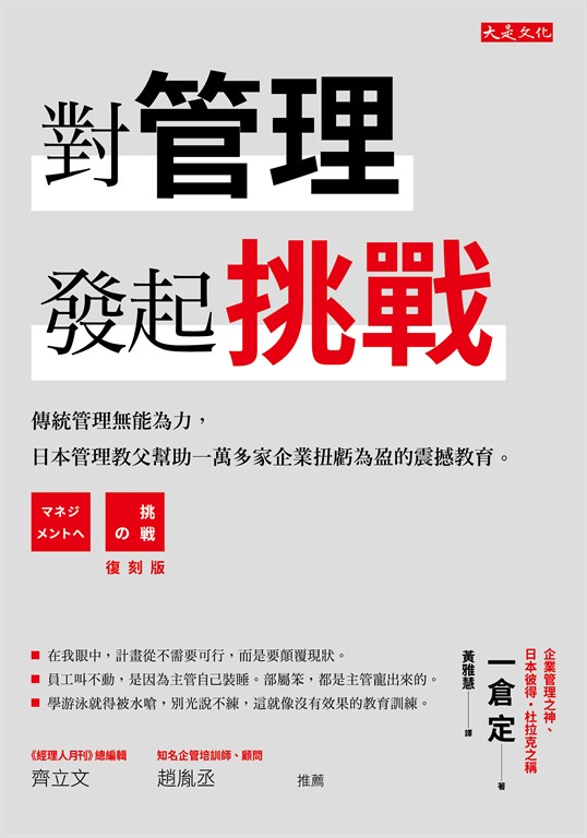 產品目錄 推薦序一 精煉一萬家企業指導經驗,跨越時空的管理思辨課/齊立文推薦序二 領先五十多年的管理學,一倉定/趙胤丞前言 他是日本的彼得‧杜拉克,連柳井正也信服/日經BP編輯部 與杜拉克同時代的日本企管之神/佐藤等代序 管理的挑戰──給經營者的震撼教育/一倉健二代序 管理就是從人而起,從人而終第一章 計畫不需要可行,要顛覆現狀1.經營者唯一的工作,決定下一步該怎麼走2.我眼中的好計畫,多數人都先說「不可行」3.只想要依循前例,哪來的創新4.管理,就是把不可能變可能5.只要方向正確,就算效率差一點也無妨6.計畫跟當初預期的不一樣了,怎麼辦?7.爭取預算不難,難的是怎麼編列8.業務量暴增忙不過來?先別急著加人第二章 企業的成敗,90%由經營者決定 1. 員工叫不動,是因為主管自己先裝睡2. 不遵守規定的人,沒有資格批評規定3. 資訊就像上鉤的魚,一到手就開始臭腥4. 成功者就像電鑽,只集中在一個點5. 主管只會喊口號,員工當然不甩你第三章 猶豫不決,比錯誤的決策更糟糕1. 魔鬼藏在細節裡,但細節在哪裡?2. 過時的數據,就像冷掉的菜3. 別浪費時間寫檢討報告4. 有錯就改,朝令夕改又何妨5. 主動製造問題,才能把事業做大6. 沒有提出解決方案的會議,馬上叫停第四章 績效的最大破口,多半出自管理層1. 組織架構要像阿米巴蟲,隨時變來變去2. 不敢冒險的企業,最危險3. 無論主管有無授權,每個人都要對工作負責4. 中階主管不要向下取暖,要向上管理5. 一個主管最多能領導幾位員工?6. 你說這是組織分工,我看就是部門主義7. 一家公司會不會賺,看出貨單就知道8. 能力不足的主管,越愛對第一線員工下指導棋第五章 帶人的功夫,管理課本不會寫1. 主管的基本功,都跟能力無關2. 所謂的毅力,就是在細節上下功夫3. 下指令前,先確認老闆要的是什麼4. 不敢做決策的主管,請趁早交棒5. 拿不出成果,一切就只是自我感覺良好6. 行程排滿檔比沒有行程更糟糕7. 多用部屬的長處,忽略他的短處第六章 主管該有的錢意識:成本分析與獲利能力1. 欠缺成本概念,賣越多賠越多2. 千金難買早知道,公司一定要有保留盈餘3. 降低成本很重要,但不是生存的首要目標4. 所有的數字要連看3個季度5. 提高工資率是假議題6. 企業獲利的3大分析指標7. 重點不是財報,而是數字背後的具體對策第七章 無法拿出成果的教育訓練,都在浪費時間1. 學游泳就得被水嗆,別在岸邊光說不練2. 經營者的所作所為,就是最好的教育訓練3. 庸才不是天生,是主管寵出來的第八章 你是來上班,還是來交朋友?1. 主管最不該有的作為:以和為貴2. 組織上下和樂融融?這種公司很危險3. 讓員工開心的唯一方法 第九章 勞資雙方永遠的攻防,工資1. 薪資、獎金、紅利,哪個最重要?2. 薪資永遠是勞資衝突的焦點3. 問題不在多寡,而是分配4. 化解勞資鬥爭的萬靈丹:拉克計畫5. 員工是資產,不是成本後記他是一位管理者,也是一位父親/柴田敏子