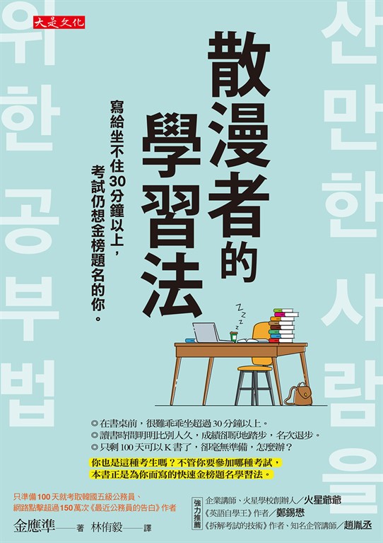 作者介紹 金應準小時候常被說「你很散漫」。因為很常東張西望,有個綽號叫「狐獴」。有一段時間,他整天窩在棉被裡大哭,抱怨:「這個世界爛透了,拿走我的專注力,還叫我怎麼學習?」當然哭解決不了任何問題,他開始尋找適合自己的學習法。多虧了自己收拾情緒後領悟出的學習法,他才能在相對較短的時間內通過最終考試。雖然在韓國三大名校之一高麗大學主修行政學,但是他對文組學習失去耐性,於是報考韓國國家技術五級考試。準備考試短短100天,就成功考取。 著有《散漫者的學習法》;在網路上連載的《最近公務員的告白》點擊量超過了150萬。成為5級公務員,不知不覺已經4年了。