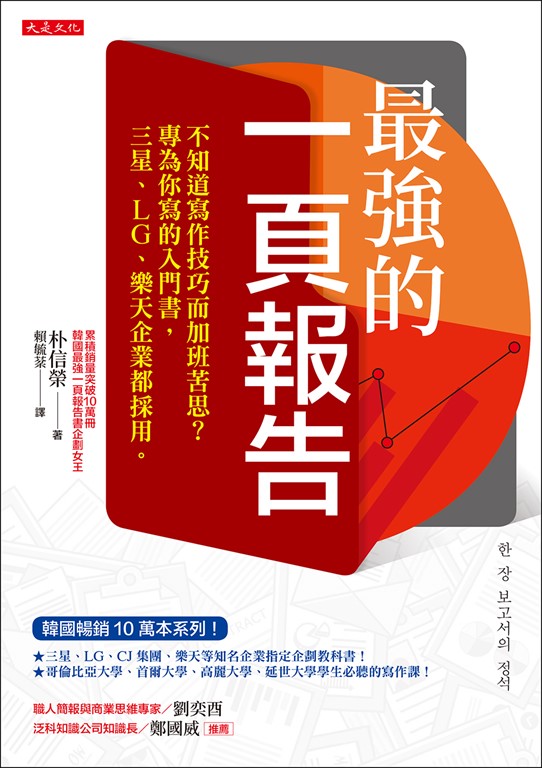 內容簡介 ★韓國暢銷10萬本! ★三星、LG、CJ集團、樂天等知名企業指定企劃教科書! ★哥倫比亞大學、首爾大學、高麗大學、延世大學學生必聽的寫作課! ◎我找了好多資料,要怎麼將50頁、上百頁濃縮成一頁? ◎主管或教授要我寫報告,我從目次開始就不知從何說起。該怎麼架構? ◎同事、同學曾笑你是「解釋蟲」嗎?意思就是你說明很多,但無趣。 有句俗話說:這世上最困難的兩件事, 一是把別人的錢放進我的口袋,另一是將我的想法放進別人的腦袋; 寫報告就是後者。到底要怎麼寫,才能讓主管、客戶都滿意? 這是一本專為不知道這個技巧,所以經常加班苦思的你,所寫的入門書。 本書作者朴信榮,有韓國最強一頁報告書女王之稱, 曾任韓國三星旗下最大廣告企劃公司第一企劃的品牌企劃人員, 目前擔任作家兼講師,教授超過10萬名上班族,關於寫作的技巧。 什麼是一頁報告?就是這明明是一份企劃書,卻只有一張紙── 事實上,就算你得寫幾十頁報告,最關鍵的仍然是第一頁。 只要運用書中提供的3種提問法、8份報告書範例,和10個寫作祕訣。 你就能學會豐田、三星、LG、樂天都在用的一頁報告。 ◎寫報告前:當主管問問題,我該怎麼答? 「可以這麼說……但好像不能那麼說……。」 「我的意思是……這樣好了,我整理好了之後,請您自己看。」 「關於您想了解的問題,相關資料我蒐集得頗完整,都在這裡,請您過目。」 如果你這樣回答,在公司就真的黑到底了, 因為這是主管最痛恨的解釋蟲,就是說明的話講很多,卻無趣又說不到重點。 本書提出跟主管報告的三大步驟:說狀況、提要求、給建議, 保證會得到「好,就照你的意思做吧」的最佳結果。 ◎報告不外乎八類型,這麼寫,立刻與同事拉開差距: 寫檢討報告,要附上根據,才能增加結論的可信度, 提出業務改善報告,要有兩組差異很明顯的數字,說服力才會高。 擬定出差報告,當然要寫成功案例,但別忘了分享失敗故事。 至於最常見的會議報告,逐字稿是大忌,只要重現會議精華就好。 書中提供8個情境範本及框架,你可以直接套用。(詳見第三章) ◎一頁報告當然要簡潔,但還要有忍不住讀下去的魅力 最實用的寫作技巧,就是——條列, 如果資料很多,你要範疇化,依空間、時間、優先順序分類; 記得刪除多餘的助詞,只用明確的動詞和名詞, 適時插入圖表和兩組數據做比較,因為數字比文字更能幫你說話。 這是一本專為不知道商業寫作技巧,所以現在還在加班的你,寫的入門書, 三星、LG、樂天企業都這麼要求、這麼用。