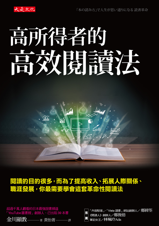 產品目錄 推薦序一 豐富人生,從品味書香開始/鄭緯筌推薦序二 閱讀能教導我們在每一個難題面前,做出有意義的抉擇/鄭俊德前言 這世上,沒有閱讀解決不了的問題第一章 高所得者都有的閱讀習慣1.生存能力強的人都這樣讀書2.不斷自問「這句話是什麼意思?」3.先看前言或後記,找出主旨4多看名人傳記,你不容易鑽牛角尖5.接收正能量的最好方法6讀完後,你要能說出自己的意見7.讓部屬常看到主管(你)閱讀的樣子第二章 這套方法,讓我一個月讀完60本書1.一口氣買四本同類型的書2.只要理解20%的內容就夠了3.重點不是讀完,而是你吸收了多少4.先從書封、書名預測內容5.為了工作而讀的書,不需要百分百透澈6.記者式提問法,大幅提升理解力7.歸納式閱讀法,訓練你用一句話說重點第三章 閱讀的好處,培養思辨能力1.思辨能力強的人,意志更堅定2.我能做到什麼?又做不到什麼?3.讀前預測,培養你的假設力4.幫你在有限時間中做出取捨5.讓思緒,有效率的汰舊換新6.怎麼用上帝視角讀一本書?7.區塊組合法,將問題各個擊破並找出解方第四章 怎麼說一本書,別人一聽就有感1.讀完後,你可以教人嗎?2.寫書評,我控制在140字以內3.聊天的最好開場白:「我最近讀到一本書……」4.用插畫或圖表做輔助,對方更專心5.要說得讓六歲孩童都能懂6.你可以從工作手冊開始練習 7.五個容易引起他人共鳴的說書技巧第五章 這不是功課,而是生活的一部分1.晚上,我一邊吹頭髮一邊讀書2.我的包裡固定放兩本書3.乘法思維,讓你成為萬中選一4.番茄鐘工作法,讀書更專心5.我理解和我知道,是完全不同的事6.人生就此改變!超推薦必讀的30本書! 後記 我從來沒聽過,有誰因買了太多書而變貧窮