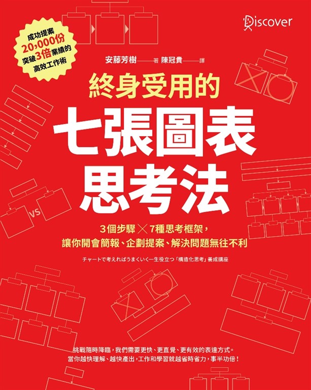 產品目錄 好評推薦前言第一章、七張圖表的基礎 ──終生受用的簡單思考法為什麼「七圖」很有效? 七張圖表的用途 1 句子圖表 2 定義圖表 3 YES/NO圖表 4 要素圖表 5 VS圖表 6 流程圖表 7 組合圖表●專欄:使用「七圖」的時機①第二章、練習轉換七張圖表 ──把圖表轉換器安裝在腦內吧! 把邏輯架構「視覺化」的訓練法 1 句子圖表 2 定義圖表 3 YES/NO圖表 4 要素圖表 5 VS圖表 6 流程圖表 7 組合圖表●練習題I第三章、把思考輸出! ──你想得太複雜了為什麼要輸出?輸出訓練 1 希望明確定義詞彙→定義圖表 2 希望強調某些優點→YES/NO圖表 3 希望整理要素→要素圖表 4 希望比較討論兩種以上的項目→VS圖表 5 希望表示時序或邏輯次序→流程圖表第四章、製作讓人說YES的資料 ──「你的提案書,為什麼這麼容易看懂?」把腦中的想法視覺化 範例1 改善內部簽核流程的提案 範例2 在公司引進自由時間的提案 範例3 向上級提議新的經營策略●練習題II●專欄:使用「七圖」的時機②結語附錄:實際範例參考文獻