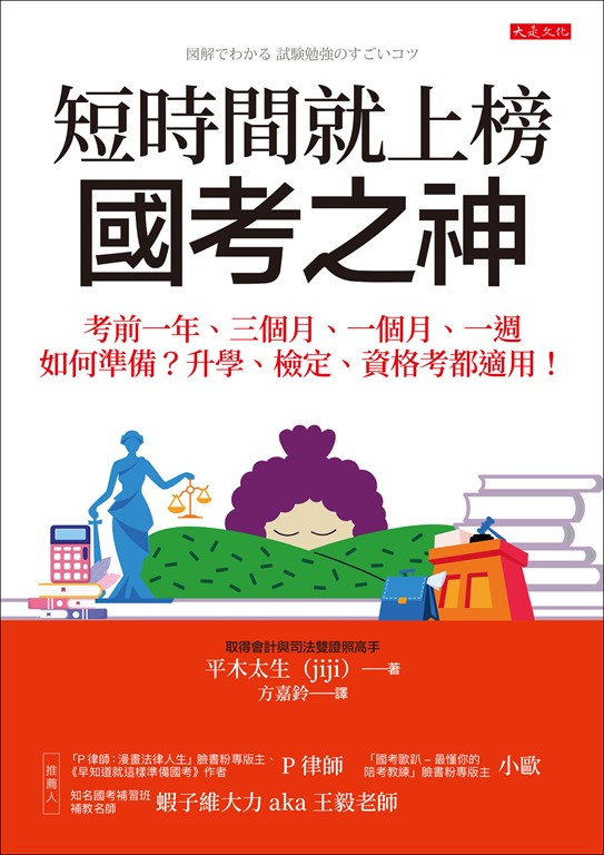 作者介紹 平木太生(jiji)國家考試合格律師、會計師(CPA)。律師事務所「律師法人Trident」合夥人、「CPA會計學院」企業法講師。就讀法政大學3年級時,順利通過會計師國家考試。進入會計師事務所工作的第4年(2012年8月)開始準備司法考試,同年12月離開會計師事務所成為全職考生。2014年11月通過司法考試一試、2016年9月通過司法考試二試,成功取得律師資格。作者將自身的考試經驗分享在部落格「國家考試合格律師、會計師jiji的讀書方法研究室」(筆名為「國家考試合格律師、會計師jiji」)中,在同類網站中排名相當亮眼。目前除了以律師、會計師為本業,更積極透過講座、書籍與部落格等媒體管道,向大眾分享讀書與學習的方法。曾出版《成功通過司法考試一、二試的超強學習法》(中央經濟社出版)等書。