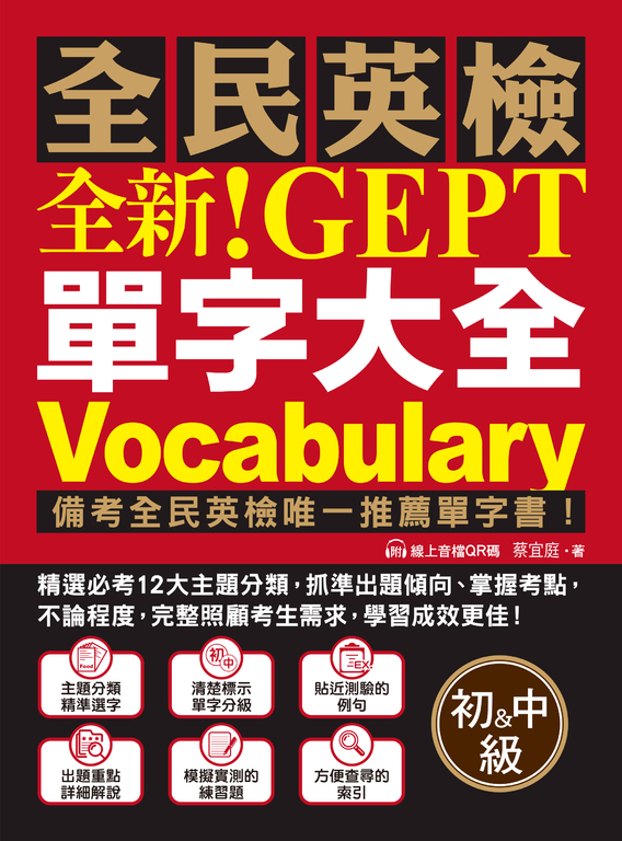 商品描述 | 全新!NEW GEPT 全民英檢單字大全【初級&中級】(附音檔) (電子書):精選全民英檢GEPT必考12大主題分類收錄各種考試一定會出現的高頻率單字、常見表達方式、不可不知的出 |