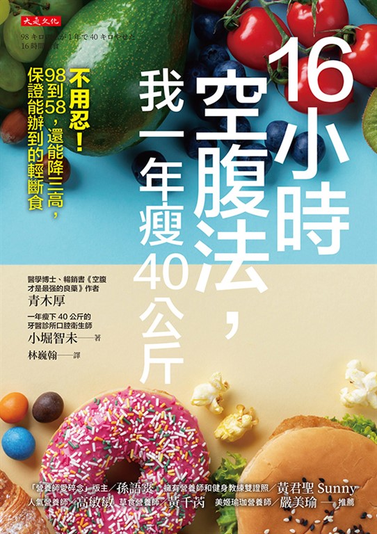 內容簡介 ◎我的工作很花體力,不吃早餐就會沒力,怎麼維持16小時不吃?◎我剛生完孩子,正在哺乳,如果空腹16小時,會影響母乳品質嗎?◎有些藥得飯後服用,萬一還是糖尿病甚至癌症患者,怎麼辦?◎我空腹就會血壓低,暈眩腳軟怎麼辦?我忍耐力強,可以超過16小時不吃嗎?◎幾歲以上的小孩才可空腹?如果施行一陣子後回復正常飲食,會胖回來嗎?何謂「16小時空腹法」?就是一天24小時中,有16個小時不吃東西,其餘8小時,想吃啥就吃啥,甜食、喝酒都可以。許多人在實踐這種飲食法後,紛紛表示「變瘦了」、「身體變好」、「病情改善許多」等,就像本書的兩位共同作者,醫學博士、糖尿病醫院院長青木厚,40歲罹患舌癌、內臟脂肪又超標,後來深入研究16小時空腹法後,並自我實踐,腰圍就從78公分降到70公分,癌症不復發。另一位共同作者小堀智未,是牙醫診所口腔衛生師,身高只有150公分,卻重達98公斤,在接受共同作者青木厚的瘦身指導後,只憑16小時空腹,另外8小時照吃甜點、喝酒,一年內竟成功減重40公斤,至今沒復胖,還瘦得很健康。這套方法為何這麼有效?為什麼有人可以成功忌口,有人卻控制不住吃東西的欲望而失敗?本書就是兩位作者用自身經歷一起現身說法。◎這不是減肥,是新的生活型態16小時不吃東西,很難?其實這其中你有8個小時在睡覺,所以只要能在睡覺前和起床後的四個小時不吃東西,就能辦到。意思就是,你的生活作息也會開始變得很正常。萬一週末假日要跑趴、約會,連續假期要出國,怎麼辦?本書提供特殊假日的16小時無痛苦空腹時間表,照著做就好。◎肚子餓很難受,怎麼撐下去?不用忍,「救援食物」幫你剛開始,先從每週一天,一天12小時做起,等習慣空腹後再慢慢延長時間。真的餓得受不了,可吃堅果、起司、蔬菜或優格,只要斷食期間,總熱量維持在200大卡內,就不會破功。書中還介紹4種輔助食品,讓你有能量撐過空腹時間。◎空腹不只能瘦身,還能抑制糖尿病和失智症的發生人體只要超過16小時空腹,體內細胞為了生存下去,就會把老的、壞的蛋白質集合起來分解,以此製造新的蛋白質,這是讓人變年輕的祕密──自噬作用(諾貝爾獎已經證明)。所以空腹16小時,就是最強的抗老法。16小時空腹法,一定要天天做才有效嗎?長期空腹,肚子會咕嚕叫,上班會很糗,怎麼辦?剛生完小孩、正在哺乳卻想瘦身的媽媽也可以執行嗎?原本血壓就很低的人,長時間不吃會不會很危險?小孩也可以長時間空腹嗎?糖尿病患者呢?所有你在執行16小時空腹法會遇到的大小問題,本書作者醫學博士、糖尿病醫院院長青木厚,統統有解。
