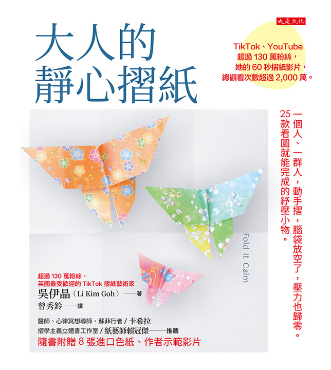 作者介紹 吳伊晶(Li Kim Goh) 插畫家、平面設計師和手作創客。因為小時候媽媽曾教她摺紙船,讓她從小就喜歡摺紙。 她將摺紙影片放在網路上分享,至今已累積超過130萬粉絲。她發現,摺紙可以幫助她保持頭腦清醒和擺脫壓力,因此期望透過舒緩的影片和簡單的摺紙技巧,讓每個人都能在摺紙中找到平靜。YOUTUBE @kimigamiTIKTOK @kimigami