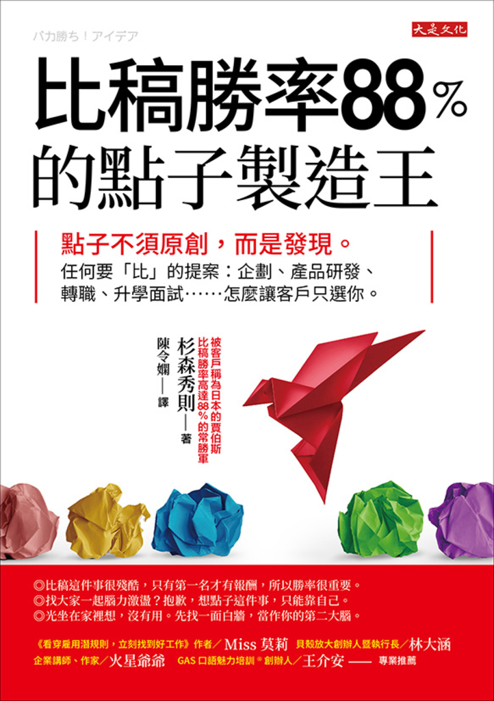 作者介紹 杉森秀則 早稻田大學商學系學士。畢業後進入NHK當導播,負責NHK Special、ETV8等各類領域的節目企劃與導演。30歲時自立門戶成為接案的廣告導演。 2001年成立影像製作中心。然而,參加比稿卻屢屢失敗,曾經好幾個月都沒有工作,也曾考慮過轉行。其後,他下定決心改革原本的發想方式,研發出本書基礎,並參加視為「最後一次機會」的比稿,終於逆轉勝。企劃與導演過聯合國、日本防衛省、環境省、三菱重工、古河電工與資生堂等政府機關與民間大型企業的影片。 每年仍持續參加約15次比稿,涵蓋活動、品牌與概念設計等領域,落選不超過2次。日本最大廣告公司電通的頂級創意人士、知名建築師的勝率都僅有30%,他的比稿勝率卻高達88%。電通稱他為「簡報大師」,防衛省稱他為「日本的賈伯斯」。