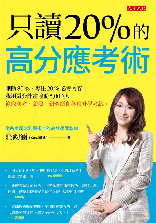 作者介紹 莊鈞涵(Carol學姊)臺灣清華大學、美國阿肯色科技大學(Arkansas Tech University,簡稱ATU)雙碩士。從小熱愛運動,成績卻一直吊車尾,直到研發並使用只讀20%的高分應考術,才讓成績突飛猛進,一次錄取4間國立大學研究所。現為「學長姊線上教育系統」創辦人,開設專門輔考的公開班,至今已幫助超過5,000位學員,大幅提升學習效率,通過各類型考試,包括:15天通過國家甲級技士術證照、乙級考試,一個月通過消防特考、國家三等考試榜首;從30名進步到第一名,以及學業成績保持前三名。此外,所經營的「學姊Carol」粉絲專頁,每日分享閱讀、學習相關文章,期許自己能在學習的路上,陪伴學員少走一些冤枉路,實現目標。