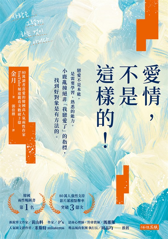 內容簡介 ★韓國兩性暢銷書第一名。 ★80萬人強烈支持,影片累積點擊率突破3億次。 ◎「他對我是真心的嗎?」如果每次吵架他都願意認輸兩次,那就是了。 ◎「他對我總是嚴守男女間的分際,真有教養!」別多想,他只是對你沒興趣。 ◎惹人憐憫的愛不是愛。你要的是戀愛,不是拯救某個人的人生。 ◎「好久不見的朋友突然跟我聯絡?」寂寞時,最該小心認識很久的人。 你和正在交往的對象,目前還順利嗎? 作者金月,是韓國具代表性的愛情諮詢YouTuber兼作家, 擁有80萬名訂閱者,影片累積點擊率突破3億次, 他的工作專替他人解決戀愛和人際關係上的困擾, 來找他求助的,除了在愛情中受傷的人之外,也有造成他人傷害的人。 本書囊括他在7年間,訪問、諮商數十萬人後,選出戀愛中男女最苦惱問題, 像是相遇與離別,誤會與理解,矛盾與和解,信任與成長, 他認為,愛不是輕鬆就能做到的本能,是需要學習和練習的技巧。 別再被小鹿亂撞左右,遇見好對象其實有方法。 ◎解讀對方真心的方法:「我們現在算是什麼關係?」 我喜歡他,他也剛好喜歡我,那份小鹿亂撞有多美好! 但要是這份悸動維持太久,反倒是種毒藥, 過於心動的感情,會影響判斷,沒辦法解決現實問題。 該怎麼知道,我們的未來可以走到哪一步? 只要一談到現實問題(「要不要結婚」),他就有所顧忌, 代表他很可能還沒準備好要結婚,或者, 他只是沒有打算要和你結婚。 ◎辨別他是不是好人的武器:他有多負責任,就有多愛你。 「不看任何現實條件,只想單純去愛,可能嗎?」 這種純純的愛,只有十幾、二十歲時能談, 如果超過三十歲,還期盼談那樣的戀情,就是不諳世事了。 況且,生活中比愛情還重要的東西,多的是。 吵架時,最能看出彼此合不合,因為不管什麼原因, 一方搞失蹤,另一方急得跳腳,這種相處模式可能一夕間改變嗎? 總歸一句:與其改變他,分手比較快。 「我們都三十出頭,交往兩年多,但男友仍沒有結婚的念頭, 周圍的人都說:『他如果真的喜歡你,就不會這樣對你。』」 其實,適婚期談的戀愛,有兩種:一種是以結婚為前提,談最後一場戀愛; 另一種是因為分不了手,所以還談著的戀愛。 戀愛不是本能,是需要學習、熟悉的能力。 小鹿亂撞絕非「我戀愛了」的指標,找到好對象是有方法的。