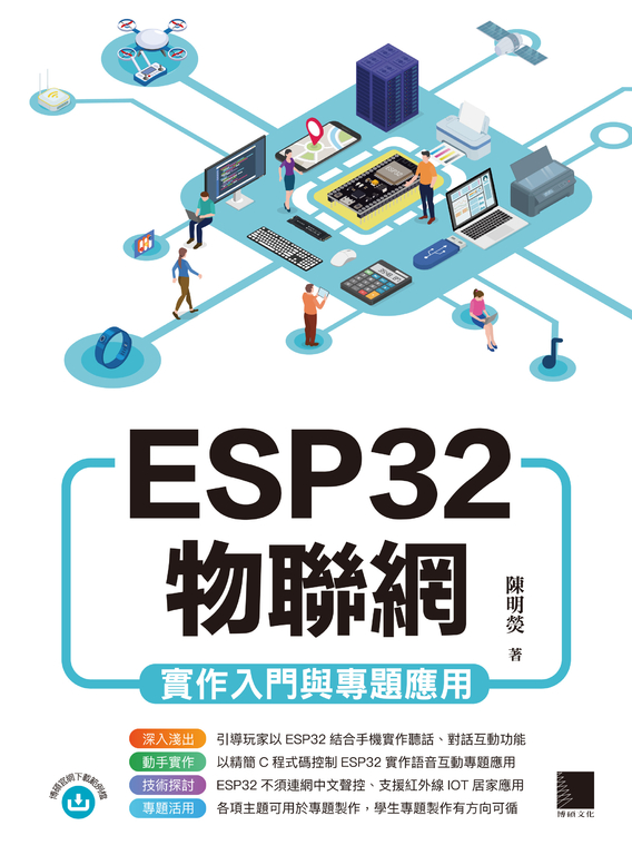 商品描述 | ESP32物聯網實作入門與專題應用 (電子書):建立ESP32實驗平台,輕鬆探索手機應用語音互動專題![深入淺出]引導玩家以ESP32結合手機實現聽話、對話互動功能[動手實作]以精簡 |