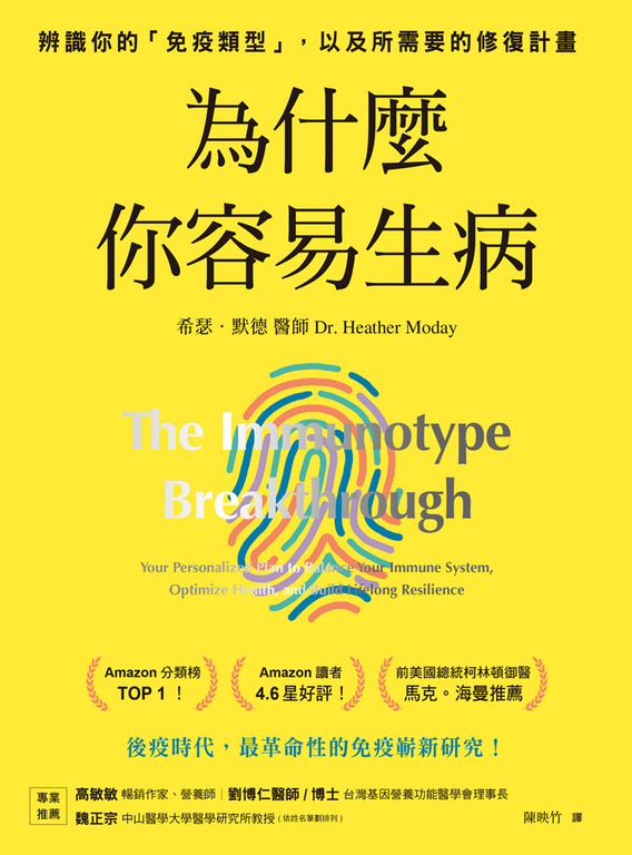 內容簡介 從心臟病到癌症、阿茲海默症到自閉症、憂鬱症到糖尿病,一切都與免疫功能紊亂和發炎有關。這本書是現代最重要的指南,可幫助我們瞭解和最佳化免疫功能。——馬克·海曼/功能醫學研究院院長、前美國總統比爾.柯林頓御醫 ★Amazon分類榜 TOP 1! ★Amazon讀者4.6星好評! ★前美國總統柯林頓御醫馬克·海曼推薦! 後疫時代,最革命性的免疫嶄新研究! 免疫系統的健康與否,將決定我們是生病死亡,還是長壽而硬朗。 ■ 後疫時代不可不知的健康關鍵 在新冠肺炎爆發之前,你可能都沒有認真思考過自己的免疫系統;卻在突然之間,當疫情大流行,免疫系統成了我們身體裡攸關生死的機制。尤其對許多人來說,免疫系統的堅固與否,決定了他們能否繼續健康、甚至活下來的關鍵。 ■ 關於免疫系統,我們可能想錯了 傳統觀念裡,總是提醒人們追求「提高」免疫力,但事實上,免疫系統有各種發展的方向,一味地強化並非好事。若用錯誤的方法對待,反而可能導致病情加劇。對多數人來說,免疫系統的「平衡」才是關鍵。本書提出「四種免疫表現型」的革命性理論,以嶄新角度幫助我們重新看待「生病」的原因,進而掌握身體狀況,並尋求真正有效的解方。 ■ 想恢復健康,從日常就能修復 身為免疫學家的默德醫師,以幽默風趣的筆調,帶領我們一窺體內的免疫大軍如何運作,以及發炎的機制、日常的習慣是如何影響免疫健康,並提供睡眠、壓力、腸道健康、環境毒素、營養五大方面的改善建議。讓你從生活中逐步修復免疫系統,減緩不舒服的感受。任何人都有能力用簡單的方法,找回身體的平衡,以及健康的主導權。 【為什麼你需要讀這本書?】 ★ 預防勝於治療:免疫失衡是所有疾病的根源,想預防感冒、過敏、慢性疲勞、腸胃不適,以及糖尿病、阿茲海默症等,一定要知道如何養護免疫系統。 ★ 準備好與疫情共存:病毒不會消失,和疫情共處已成為當代重要課題。學習成為免疫系統的盟友,能夠幫助你抵禦嚴重病情;即使生病,也會很快痊癒。 ★ 個人化修復計畫:每個人的狀況都是獨一無二的。本書提供簡單測驗,讓你辨別自身免疫狀況,並根據不同需求、習慣、預算,製作實際可行的個人改善計畫。專家推薦 ■ 高敏敏 暢銷作家、營養師 ■ 劉博仁 醫師/博士 台灣基因營養功能醫學會理事長 ■ 魏正宗 中山醫學大學醫學研究所教授 (依姓名筆劃排列)專業人士盛讚 在一個高度關注免疫系統、流行病的威脅、自體免疫的興盛及具有啟示性新科學的時代,從心臟病到癌症、阿茲海默症到自閉症、憂鬱症到糖尿病,一切都與免疫功能紊亂和發炎有關。這本書是現代最重要的指南,可幫助我們瞭解和最佳化免疫功能。對於任何擁有免疫系統的人(基本上是每個人!),以及希望追求最佳健康、避免『發炎』這個現代瘟疫的人來說,是一張不可或缺的路線圖。——馬克.海曼/功能醫學研究院院長、前美國總統比爾·柯林頓御醫 如果你求助於傳統醫學卻效果不彰,又想平衡免疫系統以實現最佳健康的人,這本書是必讀的! ——艾米.邁爾斯/紐約時報暢銷書《自體免疫自救解方》作者 默德醫師以我們都能理解的方式解釋最新的研究。最重要的是,她提供了每個人都可以採取的行動步驟,以優先照顧我們的免疫系統,提升整體健康。——威爾.科爾/功能醫學專家、紐約時報暢銷書《直覺斷食》作者 來自最優秀免疫專家之一的革命性書籍。這本書解釋了免疫最新的科學,並提供獨一無二、客製化的建議來幫助你平衡自己的免疫系統。如果你想要長壽且健康的人生,絕對不可錯過! ——傑森.瓦喬布/健康媒體mindbodygreen創辦人讀者有感推薦 任何想要擁有健康身體和頂級免疫系統的人都需要這本書!我年紀大了,有一些重大的健康問題,但是當我確診時,免疫系統發揮了它的作用,幫助我順利度過難關。每個人都應該讀讀這本書,一定令你大開眼界!建立堅強的免疫系統,能夠拯救你的生命。——Catherine Mosher 身為整合醫學醫生,我對默德醫師四種免疫類型的哲學,以及她如何以如此平易近人的方式解釋複雜的免疫系統印象深刻。作為醫生和病人,這是我今年最喜歡的書之一。—— KWT 大力推薦這本書給正在與慢性病戰鬥、或身邊有所愛之人正在掙扎求生的人。默德醫師提供了全面的建議教你如何改善免疫狀況,以及易於理解的資訊工具包。——irishgirl 默德醫師在講述治療免疫功能失調後提供了行動步驟和科學依據,讓你馬上可以開始改變你的生活,而你很快就會感覺更好,並且健康得到改善。——Cheryl
