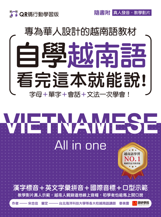 內容簡介 學越南語變得「更簡單」又「更有效率」了~最新QR碼設計,只要手機一掃,任何地方都能學專為華人設計!秒懂易學的越南語實用教材全書除了有詳細的發音教學外,並為初學者加上中文擬音,好記又好唸!結合「聽、說、讀、寫」絕對超值的綜合自學課本一本搞定!初學者所需的字母、發音、單字、句型、文法、會話!隨書附QR碼線上真人發音教學影片+音檔讓你輕而易舉就能開口說越南語■ 第一次學越南語發音就精通:書本+音檔+越南籍師發音影片教學,發音絕不搞錯在越南語中,有很多中文沒有的音,所以要學習時,常常會因不習慣或不得其要領,而感到擔心及困擾。但想學越南語卻又怕越南語很難的朋友,請不要擔心了,越南語其實沒你想得那麼難。發音是每個語言的入門門檻,本書花了三分之一的篇幅解說發音。不僅一個字一個字教讀者怎麼唸,還告訴讀者發音的小技巧。學發音時,嘴型是關鍵,嘴型不對,發出來的音絕對是錯的。本書除了提供越南語老師發音嘴型的圖片之外,更有越南語老師真人發音線上教學。讀者可以藉由線上教學影片觀察越南語老師的嘴型並加以模仿,從中比對自己與越南語老師嘴型的差異,調整自己的發音方式。當然影片要有相關設備才能看,所以不方便看影片時,本書還是有附線上發音MP3音檔,讀者可以利用音檔隨時學習。另外,對初學者來說,要記得一個陌生的文字,還要知道它怎麼唸,其實得花費不少心力與時間。因此我們特別加了「漢字擬音」的設計來達到發出類似發音的效果,藉此增強記憶,讓讀者在對越南語字母發音還不熟悉時便能達到溝通的目的(但此設計只是輔助,正確發音仍請以影片及MP3為準)。■ 第一次學越南語溝通就流利:從單字短句到會話,學會最道地的越南語聊天術越南文是標音文字,只要認得字母就可以唸得出來,但要唸得道地勢必得學好發音規則。書中發音篇除了教每個母音、子音之外,更把雙子音及介音組合的內容也列出來。讀者若學到後面發現自己唸的怎麼與MP3不同時再翻回來看一下,如此一來便能在無形中增加印象,久而久之就記起來了。文法篇章裡,作者教給讀者的是一個整體架構。先讓讀者了解越南語有哪些詞性,句子的結構有哪些型態,因為跟中文一樣是孤立語系,再用最簡單的方式介紹,一看就能懂越南語文法,若能學好這些文法,遇到越南人時便有能力用簡單的越南語與對方交流。單字篇裡收錄的詞彙全是我們日常生活中會使用到的單字,包括國家城市、家人與稱謂、身體部位、日常用品、數字與日期、時間與金錢等。學完單字之後,本書將發音、文法、單字結合起來,讓讀者學習文字長度再長一點的日常短句。這個篇章裡的短句總共分為30類,基本上表達自身情緒與意見時會用到的簡單句子都收錄在內,就算無法說一口流利的越南語,也能適時用這些簡單句型來回答越南人的問題。等前面四個篇章的東西都學好後,就會進入最後一個篇章會話課。此單元裡總共提供13個類別的生活場景對話,每個類別都有2到5個不等的情境,對話也從短句篇的一句衍生為一組三到四句的模擬生活會話。經過發音課、文法課、單字課、句型課與會話課五大篇章,你看完這本書後,就能用簡單的越南語和越南人溝通了。本書特色◆特點一:看起來困難的越南語字母,就這樣變簡單了!每一個越南文字母除了有嘴型示範及重點提示之外,還用漢字擬音及英文字彙擬音輔助記憶。◆特點二:越南語文法說明一看就懂本章將越南文基本的詞性及慣用句型透過表格及例子解說,讓越南語文法變得好簡單。◆特點三:超實用的生活單字書中收錄的單字都是實用、必須要背起來的單字。像是國家城市、家庭稱謂、身體部位、日常用品、時間日期、數字貨幣、天氣、水果、蔬菜、動物、交通、公共場所、職業、服飾、配件、顏色等,無一不是我們日常生活中天天會用到的字。◆特點四:各種情緒表達的日常短句日常短句單元中,有表達「高興、難過、生氣…等」各種情緒感受下的短句內容。每種情緒感受共有12句相當實用的短句,學會這些短句就能達到越南語基本的溝通,更能讓潤滑自己所說出來的越南語,變得更加地道地。◆特點五:情境模擬生活會話每一課情境模擬對話的前面都會先介紹一些常用短句,依情況部分常用短句將會套入會話中,並完成兩到三個模擬情境對話讓讀者練習。◆特點六:越南籍教師影片示範標準發音隨書附QR碼線上真人發音教學影片,收錄了越南籍老師的發音教學,包括母音、子音、介音組合、尾音,影片中老師們親自示範發音(含南、北音),就像是一對一的家教一般。讀者除了可以看書學習,還可模擬影片中老師的嘴型,同時比對自己發音時的嘴型看看有哪裡不同,盡可能唸出正確的音。◆特點七:附QR碼線上音檔,用聽的也能學好越南語不論是字母教學、發音教學、單字、短句、會話,可以透過掃描本書中的QR碼檔案聆聽學習,音檔皆由越南籍老師等專業配音人親自錄製,可以隨刷隨聽,達到良好學習效果。書中亦附全音檔下載,可以將全部的音檔一次下載到您的手機或電腦中使用。本書的QR碼,將帶領你進入一個最有效、最新穎的學習領域。書中隨刷隨聽與全書一次下載的QR碼,不需註冊會員,或額外安裝自己不熟悉的播放APP才能聽。(註:打包下載檔案為ZIP壓縮檔,請先安裝解壓縮程式或APP再行下載,由