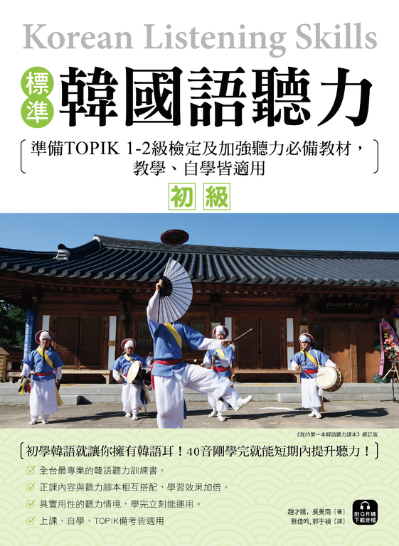 內容簡介 《我的第一本韓語聽力課本》修訂版初學韓語就讓你擁有韓語耳!主題式情境訓練法,40音剛學完韓語力就提升日常生活中會遇到的韓語都能快速聽懂教學、自學、TOPIK韓檢備考都適用!★全台最專業的韓語聽力訓練書,讓你在短期內提升韓語聽力雖然目前市面上的韓語教材琳瑯滿目,卻沒有一本書教你怎麼加強聽力。不管是老師、前輩,你問他們聽力怎麼練,他們多半會叫你多看韓國電視節目、多聽韓文廣播。這的確是練習聽力的其中一種方法,但這種方式效果有限,花費的時間也長。對時間有限,想在短期內提升聽力能力的人來說,這種方法並不可取。想要有效率的提升韓語聽力,你需要一本專門針對聽力的訓練教材。書中每課都有一項生活主題,不單單只是訓練聽力能力,而是讓這項訓練融入大家的日常生活裡。我們事先模擬了各種日常生活可能會遇到的情境,透過反覆聆聽、思考的訓練過程,讓讀者真的將「聽懂韓語」養成一種自然反應。★仿各校語學堂聽力教材課程架構,讓你像在當地學習韓語的學生一樣,接受最專業的聽力訓練!語學堂韓語課程將聽、說、讀、寫分成四科,早期有些學校會使用一本包的課本,但後來都改用單科教材了。單科教材的好處是學生可以學到的東西變多,內容較豐富,本書正是仿照語學堂聽力教材課程架構編寫而成。跟著教材內容依序學完一課之後,請記得翻到最後詳讀腳本。將腳本中不懂的單字一一查清,並自己或跟朋友一起用角色扮演的方式將腳本朗讀兩遍。接著,請再回去聽一次學完的那一課,確認自己是否都聽懂了。若還是有聽不懂的,可以再翻到腳本的地方讀一遍。這是語學堂老師教學生使用聽力課本的方式,大家可以試試!★QR碼線上下載,突破設備限制本書可掃描全書MP3下載QR碼,不需註冊會員,或額外安裝自己不熟悉的播放APP才能聽,更省去每次聽音檔都要掃描的麻煩!(註:打包下載檔案為ZIP壓縮檔,部分智慧型手機需安裝解壓縮程式方可開啟;iPhone用戶需升級至iOS 13以上,方可正常下載全書壓縮檔並開啟檔案。)另外也有線上的播放清單,只要輕點連結,就能突破地區及設備的限制線上播放。本書課程架構①課前暖身:課前暖身的用意在於喚起讀者對該課主題的興趣。在這個階段,若是老師於課堂上使用本教材,可以透過討論的方式讓學生試著說出與該課主題相關的單字。若為自學,也可以選擇自問自答的方式刺激自己思考答案。②聽力訓練:這個部分是本書重點,有點類似韓語課本的課文。但這本教材練的是聽力,所以「課文」呈現方式使用音檔播放,大家看完題目之後,仔細聽音檔回答下方問題。③聽力小技巧:聽力小技巧會告訴大家許多注意事項,譬如請大家留意短句或哪個單字的發音、變音,或是告訴讀者要多多練習哪些東西。有時候大家聽得懂80%卻卡在某些地方,聽力小技巧有點像打通大家的任督二脈,揭開盲點,聽力實力就會大幅提升。④課後活動:這個部分大部分屬於開放式問題,因此本書後面多半不會附參考答案。若是老師於課堂上使用本教材,可將「課後活動」作為課堂作業或是分組討論之後對答案;若為買來自學,可以找你們的語言交換夥伴或是補習班老師、懂韓語的朋友幫忙修改。⑤字彙與短句表達:這裡會收錄每一課的主要單字和短句表達,這些都是出現在前面聽力音檔的詞句。一個人能否聽懂韓語,字彙量是一大關鍵。因此,這一塊的單字和短句表達請讀者務必熟記,多記詞彙也是聽力訓練很重要的一環,且每一課列出的短句都是最基本應該要知道的句子。多記單字,多聽韓語,你會發現自己能聽懂的韓語對話越來越多喔。本書特色◆全台第一本針對提升韓語聽力的課本◆正課內容與聽力腳本相互搭配,學習效果加倍◆具實用性的聽力情境,學完立刻能運用◆上課、自學、TOPIK備考皆適用◆附全書音檔下載QR碼及線上播放清單
