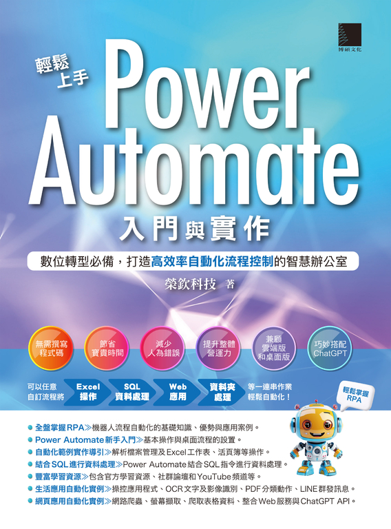 內容簡介 輕鬆掌握RPA!將辦公室的電子作業自動流程化!無需撰寫程式碼、節省寶貴時間、減少人為錯誤提升整體營運力、兼顧雲端版和桌面版、巧妙搭配ChatGPT可以任意自訂流程將「Excel操作」、「SQL資料處理」、「Web應用」、「資料夾處理」等一連串作業輕鬆自動化!★全盤掌握RPA:機器人流程自動化的基礎知識、優勢與應用案例。★Power Automate新手入門:基本操作與桌面流程的設置。★自動化範例實作導引:解析檔案管理及Excel工作表、活頁簿等操作。★結合SQL進行資料處理:Power Automate結合SQL指令進行資料處理。★生活應用自動化實例:操控應用程式、OCR文字及影像識別、PDF分類動作、LINE群發訊息。★網頁應用自動化實例:網路爬蟲、螢幕擷取、爬取表格資料、整合Web服務與ChatGPT API。★豐富學習資源:包含官方學習資源、社群論壇和YouTube頻道等。本書為讀者提供了全面且實用的RPA(機器人流程自動化)與Power Automate學習指南。從基礎入門到進階應用,囊括了RPA的各個面向,並透過豐富的實作範例展示如何將這些技術應用於工作與日常生活。無論您是初學者還是尋求技能提升的專業人士,本書將為您提供所需的知識與技巧,幫助您在數位轉型的趨勢中站穩腳步。每一頁、每一章,都是筆者精心規劃的結晶,希望透過這些文字與範例,不僅僅傳遞知識,更能激發您對自動化潛能的探索熱情。我們相信,技術的學習應該是輕鬆而愉悅的。本書精彩內容如下:☛初探機器人流程自動化RPA☛Power Automate的基礎☛第一次Power Automate自動化就上手☛桌面流程必懂的基礎知識☛檔案與資料夾自動化操作☛自動化操作Excel工作表☛自動化操作Excel活頁簿☛在Power Automate結合SQL進行資料處理☛生活應用自動化實例☛網頁應用自動化實例☛Power Automate雲端版的網路服務☛Power Automate學習資源☛ChatGPT聊天機器人與提示詞基本功