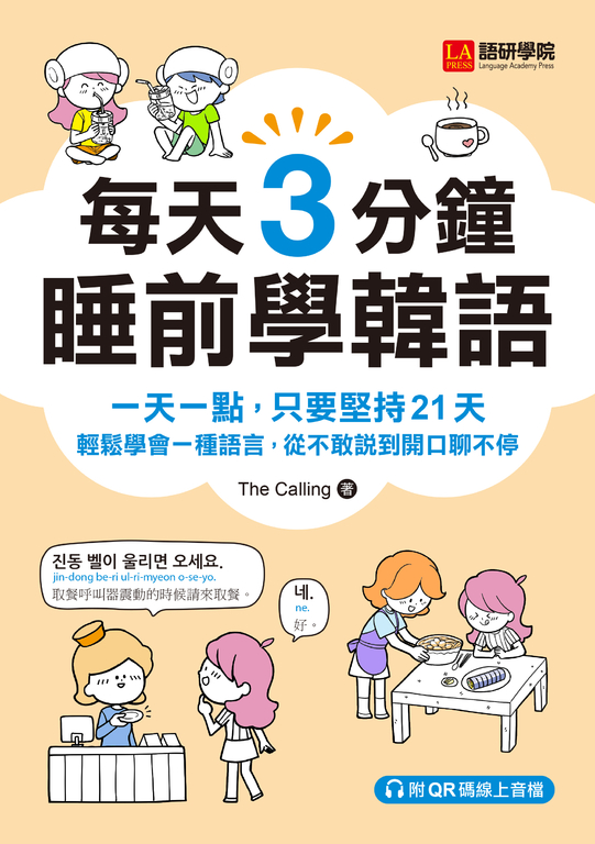 內容簡介 學韓語不難,睡前學就會!一天一點,只要堅持21天練習習慣,輕鬆學會一種語言,從不敢說到開口聊不停讓分配剛剛好的韓語日常對話,讓你在睡前稍微唸唸、隨便看看,睡眠中大腦自動幫你記憶整理,學習成就感加倍不管是日常生活或準備考試,都不會有絲毫負擔♥本書重點介紹1. 每天花三分鐘,用最輕鬆的方法學韓語現代人每天忙碌於上班、上課之間,想學第二、第三外語卻苦於時間不夠,就讓本書來幫助你!每天只需花你三分鐘的時間,睡前翻一翻、看一看、唸一唸,就能讓你學到韓語中,各種點餐、購物、交通、旅行、娛樂等…基本的生活表現。平時每天學一點,看韓劇、去韓國旅行、追韓星歐爸、交韓國朋友、跟韓國客人談生意,需要用到韓語時,韓語能力超爆發!2. 內容實用,讓韓語融入你的日常生活生活中很多句子,中文我們講得很順,換成另一個語言時往往會卡詞。別說韓語了,就連大家從小學習的英語都不見得知道怎麼講。本書收錄的生活短句,比較偏向日常生活中須使用時卻不知道該怎麼說的句子。範圍涵蓋食衣住行育樂,讓韓語徹底融入你的日常生活。3. 用漫畫形式呈現學習內容,輕鬆閱讀就能幫助讀者理解句意跟一般韓語學習書一段課文只搭配一張插圖的設計不同,本書全書60個單元都以漫畫的形式呈現。對話中文翻譯會以小字呈現在頁面正下方,但讀者可以透過上面的漫畫以及韓文句子就能大致猜測對話內容,之後再看中文翻譯確認即可。就算當天很累不想動腦,順順的讀過去,就能留下印象。★ QR碼行動學習,隨掃隨聽。一掃下載,沒有網路也能學!QR碼音檔可隨書中內容掃描聆聽,免按上下鍵搜尋,快速地讓音檔與內容互相搭配。亦可掃描全書MP3下載QR碼,不需註冊會員,或額外安裝自己不熟悉的播放APP才能聽,更省去每次聽音檔都要掃描的麻煩!(註:由於iOS系統對檔案下載的限制,iPhone用戶需升級至iOS 13以上,方可使用全書完整打包下載連結。)本書特色◆ 8大類別、51項主題,吃喝拉撒睡一本包◆ 每天只需花三分鐘閱讀,輕鬆省力◆ 超實用的生活單字、表現◆ 附QR碼線上音檔
