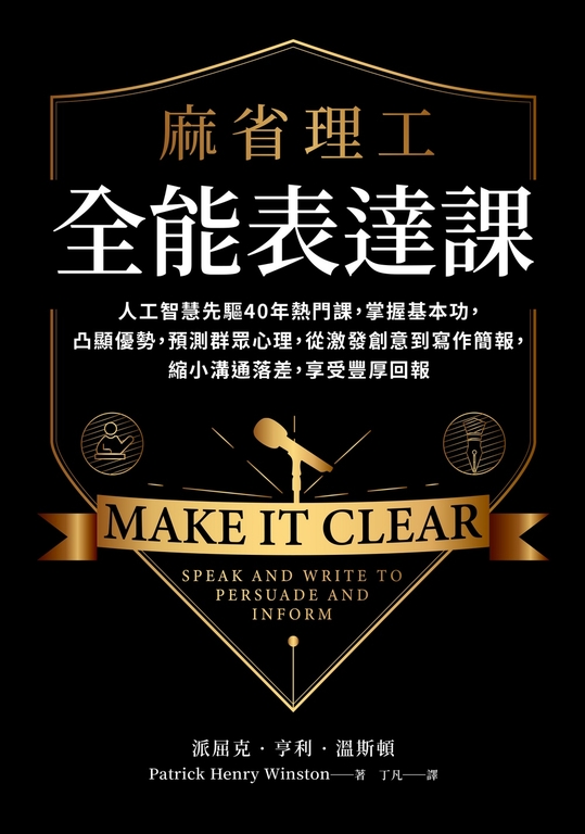 作者介紹 派屈克.亨利.溫斯頓 (Patrick Henry Winston,1943年~2019年)美國電腦科學家,在麻省理工學院任教近50年,1972年至1997年間擔任MIT人工智慧實驗室主任,曾任美國人工智慧促進協會主席,是人工智慧領域的權威。溫斯頓領導人工智慧實驗室Genesis研究小組,致力於開發具有類似人類智慧的人工智慧系統,他認為人類與眾不同之處是發展說故事、感知和理解的能力。但是無論想法多有見地,除非能以清晰明確且富有情感的方式表達,否則沒有人會在意。作者以易於理解和內容豐富的課程而聞名,他認為:軍中有規定,若軍官不提供武器就要士上戰場,應受到軍事法庭審判;若沒有足夠的表達能力就進入社會,像是沒有配備就去打仗一樣。學會口語和寫作可以更有能力、更聰明,無論是學生、上班族、創業者、企業家,都需要精進表達的技巧。40多年來,教授每年都會開設《如何表達》(How to Speak)課程,年年爆滿,甚至要限制上課人數。他在課堂上傳授學生說服、簡報、演講、寫作的方法,這門課已成為麻省理工學院的傳統,其授課影片至今已超過1,800萬瀏覽人次。作者曾獲頒美國傑出教育家獎(Baker Award)、電氣和電子工程師協會(IEEE)的國際榮譽學會教學獎、研究生委員會傑出教學獎。.溫斯頓於2019年7月在波士頓過世。