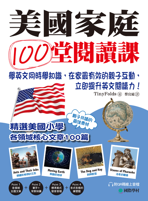 內容簡介 所有看過的父母都說讚!繼《美國家庭萬用親子英文》、《美國家庭萬用英文寫作》熱銷全亞洲後重磅推出能高度刺激孩子學習熱忱的100堂最佳英文閱讀課精選美國小學各領域核心教材,不只提升英文閱讀技巧,同時也增加各個領域的基本知識是親子共讀的最佳素材!◆ 以美國家庭的方式學習英文閱讀!爸媽一起跟孩子閱讀就是孩子最好的英文學伴。◆ 只要打開書本看文章,手機掃描聽音檔,就能培養孩子英文耳朵、英文眼睛。◆ 一本書,比數萬元一套英語教材更有用。◆ 適用各年級的小學生,不必再為了替不同年齡的老大、老二選教材而傷腦筋。本書嚴選美國小學各個主要科目必讀的 100 個主題,並符合台灣小學高年級的閱讀題材。這本書以方便孩子學習的設計為主,即使是對不熟悉英文閱讀的孩子,也依照文章的步調熟悉各領域的主題。如果持續閱讀各個領域的 100 種學習知識,不但可以累積學科的背景知識,也可以將已經知道的學習知識擴展到英文上,就能自然地感受到英文的閱讀實力提升。✦ 兼具閱讀理解和學科知識的美國教科書透過閱讀 100 篇涵蓋科學、社會、數學、文學、音樂等美國小學教課書必修的重要主題,一方面可以提升英文閱讀能力,另一方面也可以學習課程、背景知識奠定基礎。✦ 學習「專注閱讀」技巧,精準、快速地閱讀各個主題的文章「專注閱讀」的設計讓孩子在閱讀時快速理解段落的主要內容、解決各式各樣的練習題,並消化新學到的知識,使孩子能夠在短期內增進閱讀理解能力。✦ 透過各式各樣的學習素材進行有效的閱讀訓練透過總結文章和完成圖表的練習,以提升理解文章組成的閱讀技巧和字彙使用。在組織段落關鍵內容的同時,讓孩子能夠訓練出小學所必須具備的綜合思維能力。✦ 一邊聆聽音檔、一邊閱讀文章孩子可以透過聆聽以英文母語發音的音檔,來理解段落的主要內容,並從標題和圖片來猜出文章的內容。聽着音檔,透過仔細閱讀段落去理解大致掌握的內容。文章下面都有注釋單字的中文意思,孩子有不懂的單字馬上看了就知道。✦ 檢查大致的內容,並延伸背景知識透過 Check True or False(是非題)以及 Read and Complete(完成句子)來簡單地確認孩子是否理解段落,並掃描 QR 碼來確認重要單字的發音,找出單字在段落中的意思,並再次確認。背景知識 Plus! 專欄讓學習者增加廣泛的學科知識。✦ 解決各種類型的問題,並提升閱讀理解力透過解決四題選擇題來檢查學習者對段落的理解程度,超越大致理解,並培養將段落內容成為自己的能力。簡短總結整個段落。總結這一課的段落並改寫,可以讓學習者掌握課文的核心,並簡短文本的長度。Wrap Up 根據段落的性質總結段落的內容,透過將視覺化和組織單字的填空題來擴展詞彙。✦ Word Review在孩子學習了 5 個段落後,透過解決各式各樣的試題(填字遊戲、連連看、單字片語填空),可以再次確認段落中的重要單字,利用 word review 單元來讓自己再次喚起這些知識的記憶。✦ 練習題與解答讀完一個單元之後,可以翻到後面每個單元對應的練習題,再次確認重要單字的意思,透過聆聽段落的音檔、聽寫來仔細複習單字和句子,確保孩子掌握這一個單元的單字、片語,也能提升學生的聽寫能力。寫完段落的練習題,可以翻到解答篇來確認問題的答案,並找出不太理解或是錯誤的地方。✦ 附上QR碼線上音檔,隨掃隨聽,學習不中斷提供 QR 碼音檔,可隨書中內容掃描聆聽,免按上下鍵搜尋,快速地讓音檔與內容互相搭配。亦可掃描全書 MP3 下載 QR 碼,不需註冊會員,或額外安裝自己不熟悉的播放APP才能聽,更省去每次聽音檔都要掃描的麻煩!(註:由於 iOS 系統對檔案下載的限制,iPhone 用戶需升級至 iOS 13 以上,方可使用全書完整打包下載連結。)【推薦給適合的讀者】◆ 喜歡一起閱讀英文的親子本書很適合父母和孩子一起閱讀,包含各領域的多元內容、背景知識的補充,跟孩子一起閱讀時也能夠增加很多對談的機會,讓您與孩子一起增進英文,也有更多有趣的互動。◆ 一般英文學習者本書也適合讓學習者提升自己的閱讀能力,搭配練習本,讓你一邊學習英文單字、片語,一邊學習多樣的領域知識。◆ 準備去美國求學的英文學習者本書完整呈現美國小學生的課堂內容,嚴選科學、社會研究、文學的豐富知識100篇,讓你去美國求學前提早熟悉美國小學的上課方式。◆ ESL課程的老師、學生有在上ESL的老師、學生很適合將這本書當作課堂上的教材,新穎的內容搭配豐富的練習,讓你的課程不無聊又能學到英文合各領域的知識。