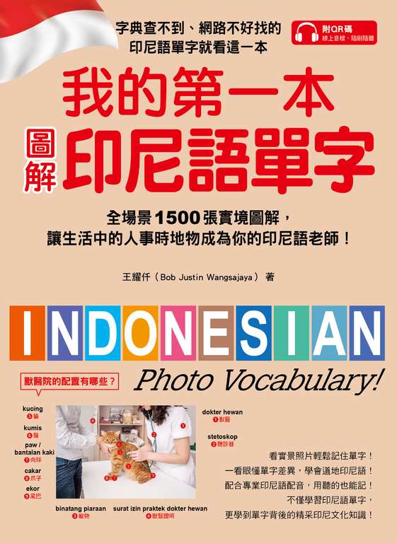 作者介紹 王耀仟(Bob Justin Wangsajaya) 華裔印尼人,國立臺灣大學中文系畢業,專攻對外華語及印尼語教學,自2018年起從事印尼語教學工作,於2020年至雅加達任教,諳熟中、英兩項外語,並擁有專業翻譯經驗。私下熱愛外語學習,在法語、日語、閩南語、粵語等語種的研究亦小有心得。於 INSTAGRAM 上開設免費對外華語學習平台(簡體中文,印尼語講解,請打 mandarin.flashcards 搜尋)。