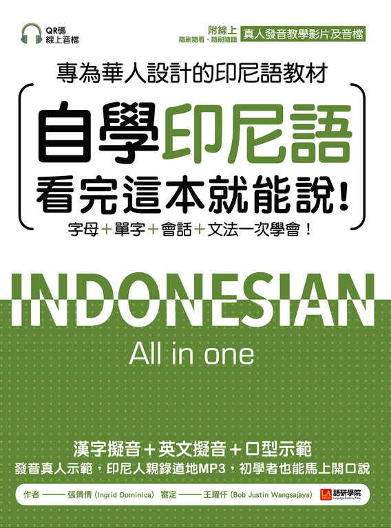 內容簡介 專為華人設計!秒懂易學的印尼語實用教材 全書除了有詳細的發音教學外,並為初學者加上中文擬音,好記又好唸!結合「聽、說、讀、寫」絕對超值的綜合自學課本 一本搞定!初學者所需的字母、發音、單字、句型、文法、會話!讓你輕而易舉就能開口說印尼語 ■ 第一次學印尼語發音就精通:書本+QR碼線上音檔+印尼籍外師發音影片教學,發音絕不搞錯 雖然印尼語是一種看到字面就唸得出來的文字,但不代表要學習印尼有就有這麼簡單!想學印尼語卻又怕印尼語很難的朋友,請不要擔心了,印尼語其實沒你想得那麼難。發音是每個語言的入門門檻,本書花了三分之一的篇幅解說發音。不僅一個字一個字教讀者怎麼唸,還告訴讀者發音的小技巧。學發音時,嘴型是關鍵,嘴型不對,發出來的音絕對是錯的。本書除了提供印尼語老師發音嘴型的圖片之外,更有印尼語老師真人發音教學影片。讀者可以藉由教學影片觀察印尼語老師的嘴型並加以模仿,從中比對自己與印尼語老師嘴型的差異,調整自己的發音方式。當然影片要有相關設備才能看,所以不方便看影片時,本書還是有附發音線上音檔,讀者可以利用音檔隨時學習。另外,對初學者來說,要記得一個陌生的文字,還要知道它怎麼唸,其實得花費不少心力與時間。因此我們特別加了「漢字擬音」的設計來達到發出類似發音的效果,藉此增強記憶,讓讀者在對印尼語字母發音還不熟悉時便能達到溝通的目的(但此設計只是輔助,正確發音仍請以影片及音檔為準)。 ■ 第一次學印尼語溝通就流利:從單字短句到會話,學會最道地的印尼語聊天術 印尼文是標音文字,只要認得字母就可以唸得出來,但要唸得道地勢必得學好發音規則。書中發音篇有教每個母音、複合母音、子音及複合子音。讀者若學到後面發現自己唸的怎麼與音檔不同時再翻回來看一下,如此一來便能在無形中增加印象,久而久之就記起來了。文法篇章裡,作者教給讀者的是一個整體架構。先讓讀者了解印尼語有哪些詞性,句子的結構有哪些型態,再用最簡單的方式介紹,一看就能懂印尼語基礎文法,若能學好這些文法,遇到印尼人時便有能力用簡單的印尼語與對方交流。單字篇裡收錄的詞彙全是我們日常生活中會使用到的單字,包括國家城市、家人與稱謂、身體部位、日常用品、數字與日期、時間與金錢等。學完單字之後,本書將發音、文法、單字結合起來,讓讀者學習文字長度再長一點的日常短句。這個篇章裡的短句總共分為26類,基本上表達自身情緒與意見時會用到的簡單句子都收錄在內,就算無法說一口流利的印尼語,也能適時用這些簡單句型來完成與印尼人的交流。等前面四個篇章的東西都學好後,就會進入最後一個篇章會話課。此單元裡總共提供13個類別的生活場景對話,每個類別都有一個以上的副情境,每個情境下對話也從短句篇的一句衍生為一組三到四句的模擬生活會話。經過發音課、文法課、單字課、句型課與會話課五大篇章,你看完這本書後,就能用簡單的印尼語和印尼人溝通了。 本書特色 ◆特點一:看起來困難的印尼語字母,就這樣變簡單了!每一個印尼文字母除了有嘴型示範及重點提示之外,還用漢字擬音及英文字彙擬音輔助記憶。 ◆特點二:印尼語文法說明一看就懂本章將印尼文基本的詞性及慣用句型透過表格及例子解說,讓印尼語文法變得好簡單。 ◆特點三:超實用的生活單字書中收錄的單字都是實用、必須要背起來的單字。像是國家城市、家庭稱謂、身體部位、日常用品、時間日期、數字貨幣、天氣、水果、蔬菜、動物、交通、公共場所、職業、服飾、配件、顏色等,無一不是我們日常生活中天天會用到的單字。 ◆特點四:各種情緒表達的日常短句日常短句單元中,有表達「高興、難過、生氣…等」各種情緒感受下的短句內容。每種情緒感受共有1-12句不等相當實用的短句,學會這些短句就能達到印尼語基本的溝通,更能讓潤滑自己所說出來的印尼語,變得更加地道地。 ◆特點五:情境模擬生活會話每一課情境模擬對話的前面都會先介紹一些常用短句,依情況部分常用短句將會套入會話中,並完成兩到三個模擬情境對話讓讀者練習。 ◆特點六:貼心的e字母發音標記辨識正式的印尼的字母結構與英文完全相同,只有「A(a)」到「Z(z)」這26 個羅馬字母,不會有類似歐洲外語中 â, ê, á, é ... 等字特殊母存在。而在印尼語裡,字元「e」的發音有兩種:①是偏向「ㄟ(A)」的發音。②是偏向「ㄜ(呃)」的發音。這兩者因於發音規則中,沒有太過明確的規則可言,致使學習者在記憶印尼語時,往往不容易背下正確發音。為了解決此一窘境,本書中特別將發音偏向①「ㄟ(A)」的母音,在上面加上一條斜線變成「é」的方式呈現;反之,則是偏向②「ㄜ(呃)」的發音。再次提醒,這條斜線是幫助了解發音的識別記號,當正式書寫印尼文時,頭上沒有一撇的「e」才是正確的字母。 ◆特點七:印尼籍教師影片示範標準發音隨書附印尼籍老師的發音影片教學,包括母音及子音。影片中老師親自示範發音,就像是一對一的家教一般。讀者除了可以看書學習,還可模擬影片中老師的嘴型,同時比對自己發音時的嘴型看看有哪裡不同,盡可能唸出正確的音。 ◆特點八:QR碼線上音檔,用聽的也能學好印尼語不論是字母教學、發音教學、單字、短句、會話,本書都備