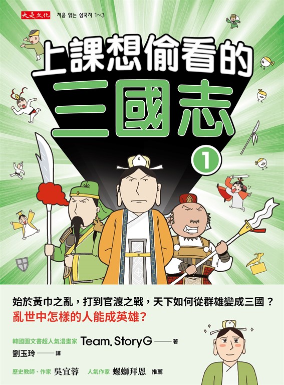 內容簡介 ★ 三國粉必收:「上課千萬不要看!保證有趣到科科偷笑!」‧桃園三結義怎麼來?沒鬧你,就是從男男搭訕展開。‧什麼是群雄割據?打不贏就急call隔壁諸侯──憑什麼要人家幫你?‧怎麼打造人設?關羽「溫酒斬華雄」:在酒涼掉以前,就取下敵方人頭。‧劉備與諸葛亮的相遇:「我的心情,就好比一隻魚遇到水。」部屬比上司能幹。 東漢末年,為了改變腐敗的世界,名為「黃巾賊」的盜匪出現了! 於是,朝廷開始在全國各地招募百姓,討伐黃巾賊。 但是,比外敵更可怕的往往是內賊! 此時把皇帝當成人質,順利掌握權力的董卓, 開始了一連串殘暴的統治政策。 各地為了群起反抗,還組成聯盟,但打垮董卓之後則是誰也不服誰, 這個時代,需要有人來終結亂世, 這就是「三國」故事的由來。本書由韓國圖文書超人氣漫畫家Team. StoryG繪製,用輕鬆的漫畫,加上爆笑流行哏,領悟三國故事給我們的啟示,讓你上課忍不住也想偷看!本書共分兩冊,從黃巾之亂、群雄割據、官渡大戰(1),到赤壁之戰、三分天下(2),收錄三國攻略筆記:人物關係表、征戰遊戲地圖,帶你像玩線上遊戲一樣,搞懂三國人物鬥智鬥勇、爾虞我詐的歷史。◎反董卓聯盟:英雄爭霸變打地鼠遊戲,不是你死就是我活 東漢末年動盪不安,董卓挾持漢獻帝、把持朝政, 在諸侯的圍攻下,最後放火燒洛陽城逃到長安。 曹操一心想殺董卓、救皇帝:「誰要一起上?」 反董卓聯盟卻傳來: 袁紹大人已退出群組。袁術大人已退出群組。孫堅大人已退出群組。 劉備大人已退出群組。 曹操:真假?剩我一個人? 英雄不是最強的人,而是能存活下來的人。 群雄割據,怎樣的人會是贏家? ◎官渡之戰:亂世就是昨日稱好友,今日死對頭 眾人齊心扳倒董卓後,最強的兩隻地鼠終於誕生──曹操與袁紹, 但兩人卻為了爭奪唯一的王位,在官渡決一死戰。 面對袁紹十萬大軍,曹操死不出城: 「別人一日三餐,我從今天起一日一餐!」撐下去就是你的?還得有奇謀。 以弱勝強,劉備還不算是三國第一個典範,曹操才是。 黃巾之亂、群雄割據、官渡之戰, 最亂的時代卻也是人才輩出各展長才的時代, 英雄這麼多,他做了什麼能讓他笑到最後?