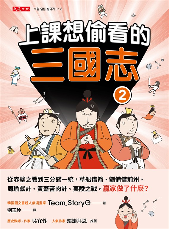 內容簡介 ★ 三國粉必收:「上課千萬不要看,保證有趣到科科偷笑!」‧曹操攻打漢中,用「雞肋」當暗號,這是春川辣炒雞?還是?職場說真話,找死。‧諸葛亮:3天備10萬支箭?好喔,2個假日和1個晚上。敵人挖坑,他還跳?‧趙雲為救阿斗闖入敵營,劉備趁亂告白:「再也沒有這樣的人!」愛才如命得人心。‧關羽為何被孫權伏殺?「閉嘴,你這個江東鼠輩!」低調,是萬年生存法則。‧劉備為何要自封「漢中王」?「竟然有人(曹操)背假貨,我才是真貨!」眼看著各方勢力一一被曹操併吞,劉備、孫權決定結為同盟,不過兩方人馬卻出現了矛盾……。接著,劉備自封「漢中王」,局勢再次出現逆轉,勢力最龐大的曹操,就此成了不折不扣的逆賊。諸葛亮五次北伐,為何最終沒能實現一統天下?本書由韓國圖文書超人氣漫畫家Team. StoryG繪製,用輕鬆的漫畫,加上爆笑流行哏,領悟三國故事給我們的啟示,讓你上課忍不住也想偷看!本書共分兩冊,從黃巾之亂、群雄割據、官渡大戰(1),到赤壁之戰、三分天下(2),收錄三國攻略筆記:人物關係表、征戰遊戲地圖,帶你像玩線上遊戲一樣,搞懂三國人物鬥智鬥勇、爾虞我詐的歷史。◎赤壁之戰:弱者結盟,血戰之前先舌戰眼看曹操平定北方,劉備、孫權決定聯盟力抗,兩方卻先陷入舌戰。諸葛亮如何一人堵住7位孫權軍師的嘴?這個各懷鬼胎、情誼脆弱的同盟,如何協同作戰?終於,周瑜和諸葛亮火燒曹操百萬大軍。把大船連在一起,這是誰出的「餿」主意? 這場奠定三國鼎立的戰役,將於赤壁開打……。◎劉備的一統大夢,是你的跑不掉,不是你的求不到《孫子兵法》曾說:「兵者詭道也。」(戰爭就是騙術)劉備發動夷陵之戰,企圖替關羽報仇,沒想到卻敗在菜鳥將軍陸遜手上;吳魏簽下友好合約,曹丕卻下令攻打吳國,此時陸遜竟斗膽向劉備提和解:陸遜:有人在嗎? (傳送照片、電子禮券)劉備:我知道了!和解吧!蜀國放棄征吳,是神之調度,還是腦袋壞掉?放下恩怨,比打天下更重要。吳蜀真的無法滅魏嗎?諸葛亮和司馬懿,如何鬥智定生死? 你會看到:草船借箭、劉備借荊州、周瑜獻計、黃蓋苦肉計、夷陵之戰, 從赤壁之戰到天下一統,誰是最後贏家?