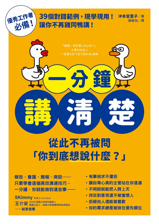 作者介紹 沖本留里子(Okimoto Ruriko)一分鐘溝通顧問。致力於「五分鐘會議」的推廣,主張「管你是老闆還是誰,所有意見都要一分鐘以內表達清楚」。培育人才與組織的專家,CHEERFUL股份有限公司創辦人。出生於廣島,曾任職於江崎固力果,後來進入顧問業,從事業務改善、業務改革等專案管理,不到三十五歲就當上董事。身為領導者,在推進DX數位轉型的過程中,總是為與部屬之間的齟齬、部門間的衝突等所苦,最後公司倒閉。深感「順暢的溝通」是打造不倒閉公司的必要條件後,開始研究「怎樣表達能讓聽話者輕鬆理解」「如何表達能讓聽話者採取行動」。後來發現,表達的重點就在於「要在一分鐘內說清楚」。現以「活用會議,培育自律型人才與改革組織」為核心,擔任以企業為對象的管理顧問與培訓講師。同時於明治大學擔任進修部學分班講師,也曾在台灣勞動部主辦的研討會上登台演講。其溝通表達技巧簡單、可立即實踐,且效果顯著,廣受大眾好評。著有《1分鐘高效表達術,讓你說話不再被當空氣!》、《「高速會議」育才效果超群!領導者的溝通教科書》(暫譯)、《一分鐘內講完秒懂,別人馬上行動》(暫譯)等書。官網:www.e-cheerful.co.jp