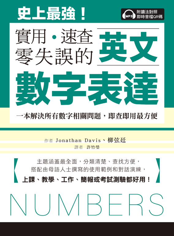 內容簡介 遇到這些情況,你知道要怎麼用英文說嗎?「每罐 200ml 售價台幣 1350 元」做工作簡報怎麼說?「3×4=12」、「時速 90 公里」或「第 46 屆總統」上講台時怎麼說?日常中經常會用到的「地址、尺寸、日期、時間、面積……」生活中隨處可見的數字,如何用英文表達可不簡單!!!主題最全面、分類最清楚,收錄生活中所有與數字相關的英文讀法及相關知識,搭配各種生活情境、使用範例,讓你「自然記住」所有讀法!無論是日常對話、工作商務,還是英檢多益等證照測驗,甚至是在教室教學、到海外旅行,只要有數字就用得到!平時輕鬆跟著唸、臨時緊急快速查,不只實用還好用!主題分類、好查好記又好用的英文數字表達寶典!從時間、數量、距離,到年代、地址和單位順序,涵蓋生活中的所有數字,一次解決所有說不出口的窘境!我們在學英文時,一直都將學習重點放在單字或文法上,句子裡時不時出現的數字,卻總是因為「那是數學要學的吧」的心態而忽略過去,又或是老師在上聽力和口說時,遇到數字就大概提一下該怎麼說,可是下次換個情境或換個單位,就又不會講了。結果每次要讀數字的時候,只能用猜的大概講講看,也不知道自己講的是對是錯,運氣好對方聽懂了、運氣不好聽不懂還只是小事,除了造成誤會和衝突,更有可能讓你因為表達錯誤而產生進一步的財務損失!本書收錄日常生活中至關重要的數字讀法,從電話號碼、樓層到看醫生會用到的體溫或脈搏血壓數字,又或是買鞋子時要說的尺碼、配眼鏡會用到的度數,全都完整收錄、詳細解說,搭配音檔帶你一起開口唸,不管什麼情境、數字出現在哪裡,都可以正確唸對!我們的生活離不開數字,英文當然也不能漏掉這塊,從此再也不說錯!★ 主題涵蓋食衣住行,分類清楚、解說好懂,不只深入學習,查找也快速方便!數字在生活中無所不在,本書以日常生活為核心,並按照主題分類成如「跟住宅、通訊有關」、「跟交通有關」、「跟衣服或食物有關」等等內容,再利用各個模擬情境的子單元細分,例如在「跟衣服或食物有關」的章節中,就出現了「比平時穿的尺碼再大兩號」、「一小撮鹽巴」、「二星級餐廳」等內容,接著根據主題詳細解說各種數字讀法,不只好學好懂,臨時想查也能快速按照主題輕鬆找到!★ 由母語人士撰寫、最貼近生活的例句和對話演練,與生活結合才能真正學會!數字會出現在生活中的每一處,因此唯有徹底貼近生活,學到的才會是真正好用的英文!本書收錄的示範例句及對話演練,皆由英文母語者融合當地生活經驗悉心撰寫,不只可以透過這些句子好好學習數字的讀法和寫法,更可以直接運用在生活之中,讓你的學習不只是紙上談兵! ★ 除了數字,與數字搭配的單位、符號、縮寫、慣用表達,也一次告訴你!日常生活中常會聽到:「大罐的是 1.5L」、「這瓶只有 500ml」,這裡的 L 和 ml 可不是「欸摟」和「莫」!如果不知道正確的單位讀法,就算數字唸對也是徒勞無功。本書不只著重在數字讀法,也詳細說明搭配使用的各種單位、符號、縮寫、慣用表達等必備資訊,讓你在用數字表達時不再缺了那重要的一角,順利溝通不出錯!★ 除了讀法,數字的排列順序和單位寫法也一次告訴你,不只會唸,還能正確不寫錯!讀法雖然重要,寫法的重要性也不可忽視!就拿最簡單的日期來說,「2024年 7 月 5 日」寫成英文,到底該寫「07 05 2024」還是「05 07 2024」呢?而「西元前 657 年」和「西元 908 年」又要怎麼寫成英文呢?除了怎麼唸,本書也詳細說明數字的排列順序、單位要放在前面還是後面等等,正確書寫一定要會的知識,碰到需要寫的場合也不怕會寫錯!★ 以對照方式呈現英文讀法,方便閱讀又好懂!搭配音檔跟著唸,學習效果更提升!書中特別以對照方式呈現數字唸法,例如「時速 90 公里」不會只寫「90 kph」而是「ninety kilometers per hour」,就算當下不方便聽音檔,也可以直接一邊看書一邊唸,學習效果不打折!如果搭配本書所附的音檔,邊聽邊看邊開口唸出聲,記憶更加深刻、成效更上一層樓!★ 附贈 QR 碼線上音檔隨掃隨聽!本書音檔以QR 碼方式提供,可隨書中內容掃描聆聽,免按上下鍵搜尋,快速讓音檔與內容互相搭配。亦可掃描全書 MP3 下載 QR 碼,不需註冊會員,或額外安裝自己不熟悉的播放 APP 才能聽,更省去每次聽音檔都要掃描的麻煩!(註:由於iOS系統對檔案下載的限制,iPhone用戶需升級至iOS 13以上,方可使用全書完整打包下載連結。)本書特色◆ 完整收錄生活中會遇到的各種數字的英文讀法,最貼近食衣住行育樂的英文數字表達!◆ 無論是數字、符號、單位還是相關表達,全都分門別類、清楚解說,就算遇到數學公式也不怕!◆ 不只是讀法,也告訴你排列順序和單位寫法等必要資訊,正確不寫錯、會讀會寫最全面!◆ 搭配貼近生活的例句和對話演練,生動有趣又能讓你體驗實際運用的感覺,應對更熟練!◆ 對照呈現數字、單位及相關表達的英文讀法,方便閱讀最好用,搭配音檔跟著唸,成效更佳!