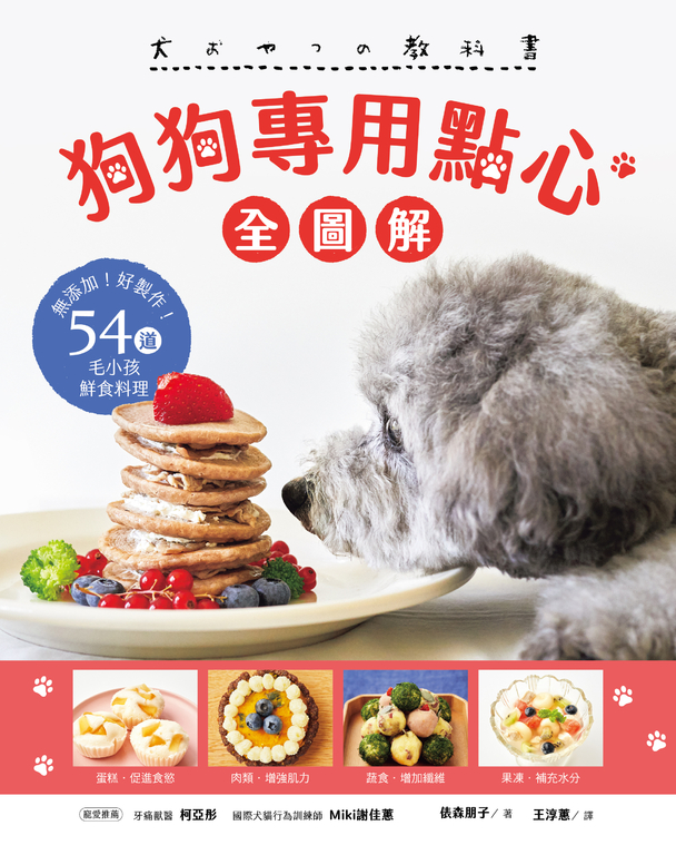 內容簡介 專為狗狗設計!自己做更安心!\健康、美味且容易製作的手作點心食譜/牙痛獸醫柯亞彤、國際犬貓行為訓練師Miki謝佳蕙,寵愛推薦──別再拿人類的食物餵養狗狗了,自製適合愛犬的料理,才是真愛牠!從日常零食到節日慶祝,狗狗們最愛的點心大集合!當你在吃東西時,是否會隨手給身邊的毛孩一塊餅乾、一口蛋糕?小心!這個動作恐會造成狗狗的健康危機!人類點心都以碳水化合物為主,含有高糖、高油脂等添加物,若不慎誤食葡萄、洋蔥等食材,對牠們而言甚至是有毒的!即便購買市售寵物零食,甜味劑濫用、標示不清、分裝風險也讓人難以安心!◎專為狗寶貝設計的點心,爸媽做的開心、毛孩吃的滿足!本書作者為資深飼育達人、飲食療法講師及寵物鮮食工作室創辦者,長年鑽研兼具狗狗營養健康及適性美味的食譜,針對天性不喜歡喝水、不愛吃蔬菜,容易生病的毛孩們,設計出54道無添加、好製作的鮮食料理!只要透過簡單的攪拌、乾燥、微波、烘烤,輕鬆做出酥脆雞柳仙貝、雞蛋小饅頭等健康零食,就能讓狗狗在快樂享用的同時,有效補充飼料缺少的水分及營養素,利用天然食材的力量,為親愛的毛孩提升免疫力及抗病力!本書特色特色1【多元豐富料理】根據狗狗適性口味,從飲食重點、食材挑選依循製作料理!人類吃的蛋糕、餅乾、饅頭等,都是以碳水化合物為主,但因為狗狗是「肉食性的雜食」,碳水化合物對牠們來說並不容易消化。本書提供基本營養知識和食材選擇指南,幫助主人了解如何為狗狗提供全面且均衡的料理。多數狗狗較偏愛肉、魚等動物性蛋白質,因此,就算成品看起來跟人類的點心很像,事實上都是用絞肉做成的蛋糕塔皮、利用魚或肉放進寒天或湯汁中、把肉粉加進料理中讓狗狗「聞起來好吃」。只要多下些工夫,就能做出讓狗狗身心愉悅的甜點!特色2【完整圖解說明】從簡易日常點心到節慶祝賀蛋糕,提供54道狗狗專用點心!本書收錄各種餅乾和零食簡單作法,以及在特別日子或是節慶祝賀時,總有想和親愛的毛小孩一起度過,可製作適合狗狗吃的生日蛋糕、鬆餅、塔派等,書中每一道食譜都配有詳細的圖解說明,從食材準備到烹調過程,再到成品展示,步驟清晰且簡單易懂。即使是廚藝不佳的新手也能輕鬆上手,為狗狗製作出營養豐富的美食。特色3【料理新手也會】不需要烹飪技術,只需1個步驟、簡單小家電就能輕鬆完成!本書的點心食譜不用特別費心準備食材,只要有鍋子、烤箱等小家電,步驟簡單就能快速上菜。此外,書中明列愛犬需要的點心分量與正餐的比例原則,飼主可以由狗狗體重來調配,喜愛的食材選擇、料理重點、鮮食保存方式等,讓飼主安心備餐,愛犬快樂用餐。特色4【可與狗友分享】收錄點心包裝法,讓製作的美味料理可以分享給狗狗朋友!因點心一次製作分量較大,可以做好後分享給其他狗狗朋友,作者設計出適合做為禮物的點心食譜及簡易包裝方法,例如地瓜金磚、可麗露禮盒、蘋果塔等保存期限較久的甜點,兼具手作心意及營養美味的料理。好評推薦「毛孩爸媽都很喜歡煮好吃的東西給家裡的毛寶貝吃,但常常不知道毛小孩到底可以吃什麼樣的點心,甜度應該怎麼選擇?用料怎麼處理?怎樣可以符合健康的需求同時又好吃漂亮!這本書完全解決毛孩爸媽的問題,教你做出美味又可以拍照上傳炫耀的好吃餐點!陪伴家裡毛孩度過每個值得紀念的日子!」--牙痛獸醫 柯亞彤「主人重視毛孩們的食衣住行育樂,儀式感也不能少。清晰明瞭還有搭配圖解的食譜,讓我想立刻動手做給孩子們,食物豐富化的同時連主人也享有了視覺饗宴。」--國際犬貓行為訓練師 Miki謝佳蕙