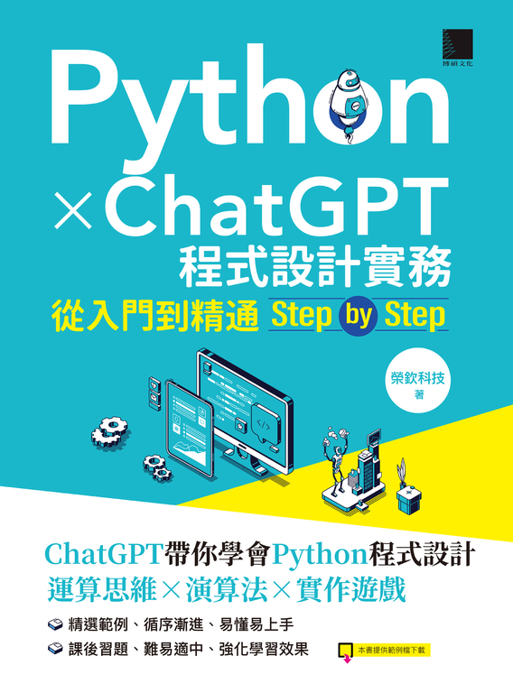 商品描述 | Python X ChatGPT程式設計實務:從入門到精通step by step (電子書):ChatGPT帶你學會Python程式設計!運算思維×演算法×實作遊戲精選範例、循序漸進、易懂易上手課後習題、 |