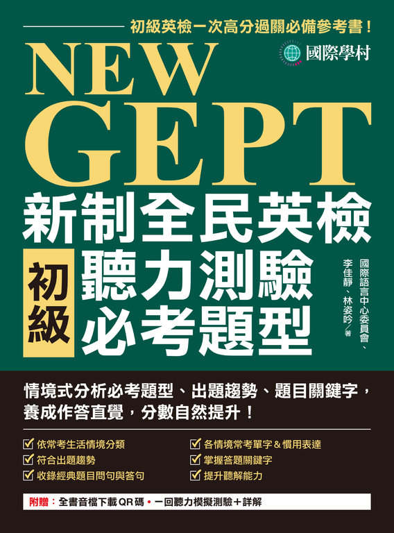 作者介紹 作者簡介國際語言中心委員會成立於1981年,由一群受過專業語言訓練,並且具備實務教學經驗的委員組成。多年來持續推動英語基礎教育訓練,不但持續研究最新的語言教學趨勢,更融合語言學理論,開發出「聽、說、讀、寫」四項能力並重的學習教材,幫助世界各地的華人克服學習障礙,在每年各大語言檢定中獲得高水準的成績。李佳靜 Gracie Lee學歷:英國約克大學英語教學碩士經歷:文藻外語大學講師、中山工商合作產學案中級英檢培訓班講師、國立臺灣師範大學研究助理 專業:第二外語教學、英文檢定相關課程、英文聽力遠距教學林姿吟 Lorna Lin學歷:美國加州州立大學英語教學碩士經歷:文藻外語大學講師、中山工商合作產學案中級英檢培訓班講師專業:第二外語教學、英文檢定相關課程、英文聽力遠距教學